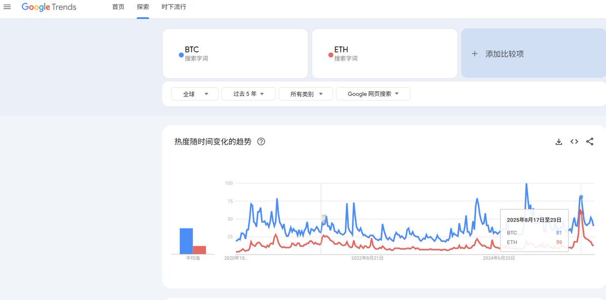谷歌指数已经疯狂了 这么多年观察了各种指标 说实话 只有谷歌指数每次都是对的 这个指数虽然不能精准的预判点位 但预判行情阶段没有错过 根据谷歌指数 目前即便不是行情顶部 但绝对已经过了腰部 大概率是鱼尾行情 这个行情可能很暴力 错过很可惜 但盈亏同源 这个阶段也是亏大钱的阶段! https://t.co/pDrSFc3cv4
