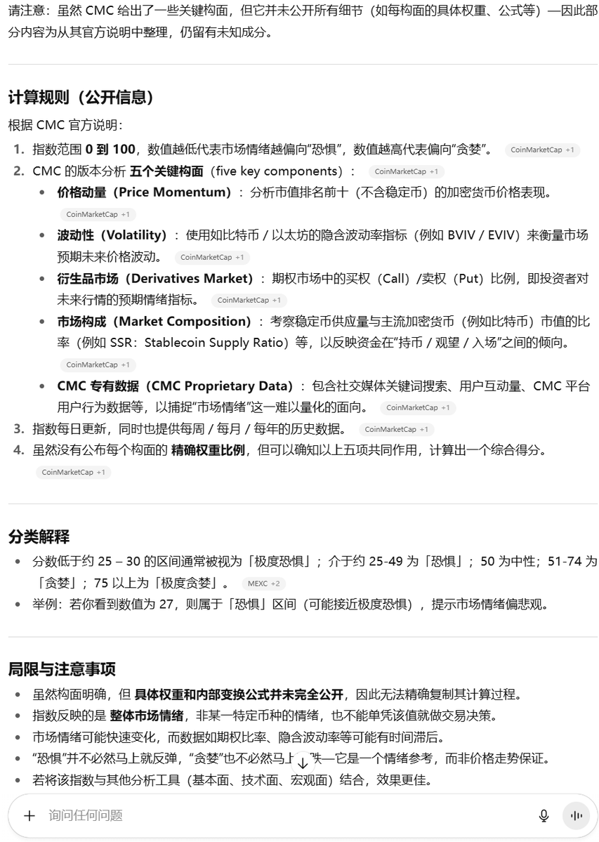 CMC上恐惧指数又快到 20(极度恐惧)了 问了下ChatGPT,这个指数具体是怎么算的 主要包含以下五个维度,但具体计算公式好像没有公布: 1、价格动量 2、波动性 3、衍生品市场 4、市场构成 5、CMC 专有数据 详细说明参考截图