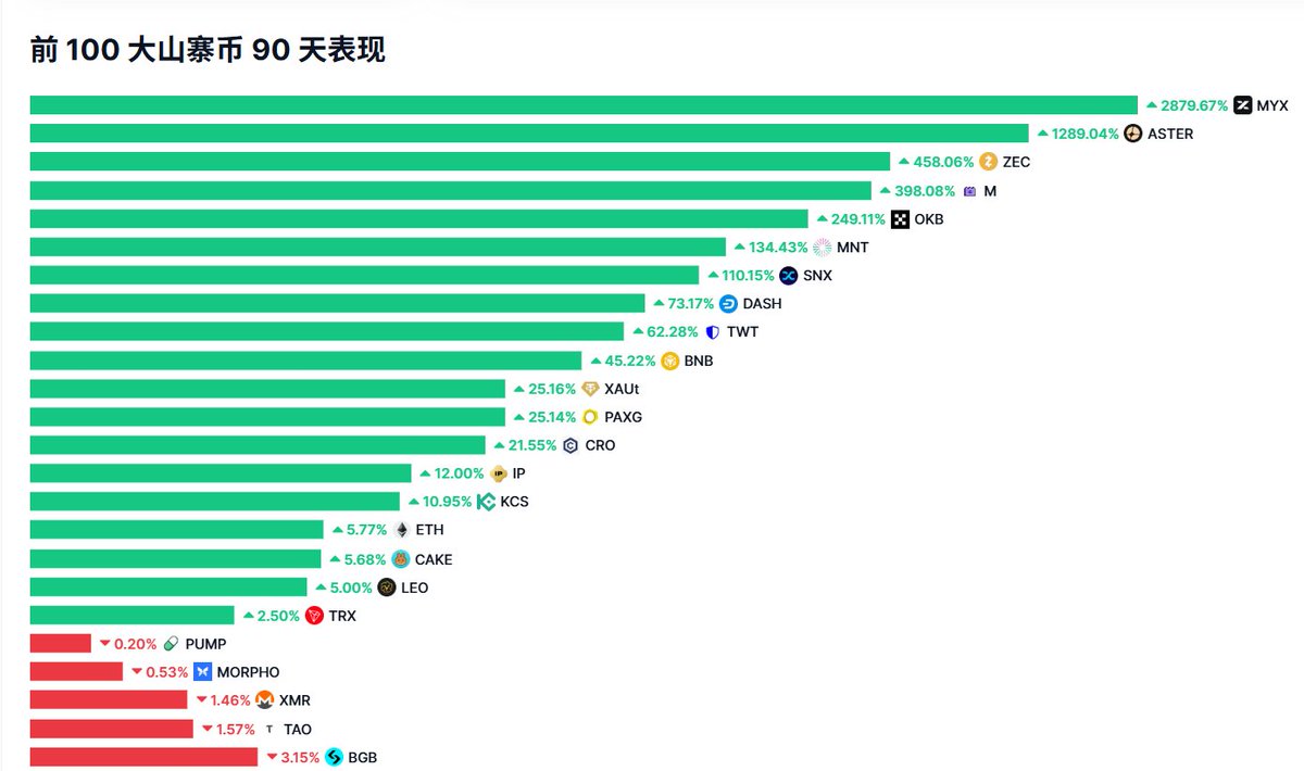 前100大山寨 90天涨幅为正的只有20个了 这里面还有2个是黄金 好几个币安系 因为币安系前面正好发力了一波