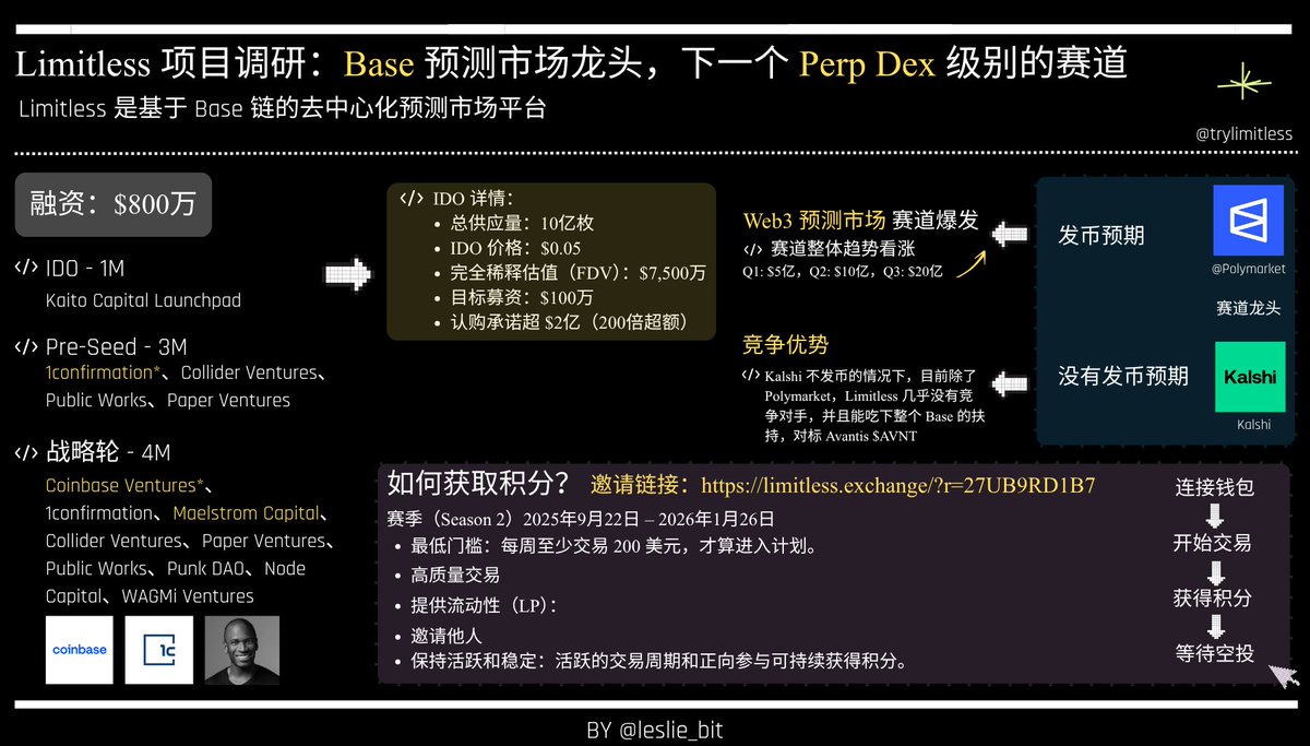 比起难以捉摸的 Polymarket,我选择了更能把握的 Limitless。融资 800W,但是有 Coinbase 的领投,还有Arthur Hayes的参投,目前独占了 Base 里预测赛道的份额。