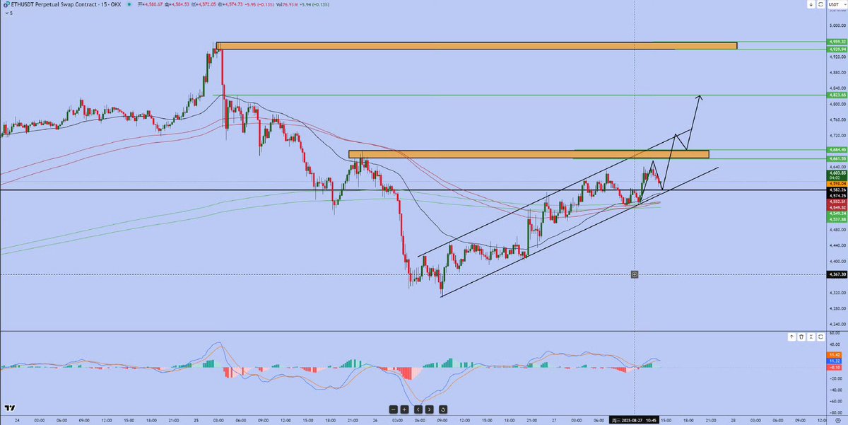 7.上涨趋势看支撑,下跌趋势看阻力,当币价上涨的趋势,依托支撑线操作成功率很高,回踩低吸的机会,而下跌趋势中,阻力线操作成功的机会很高,可以开空,或者是离场的机会