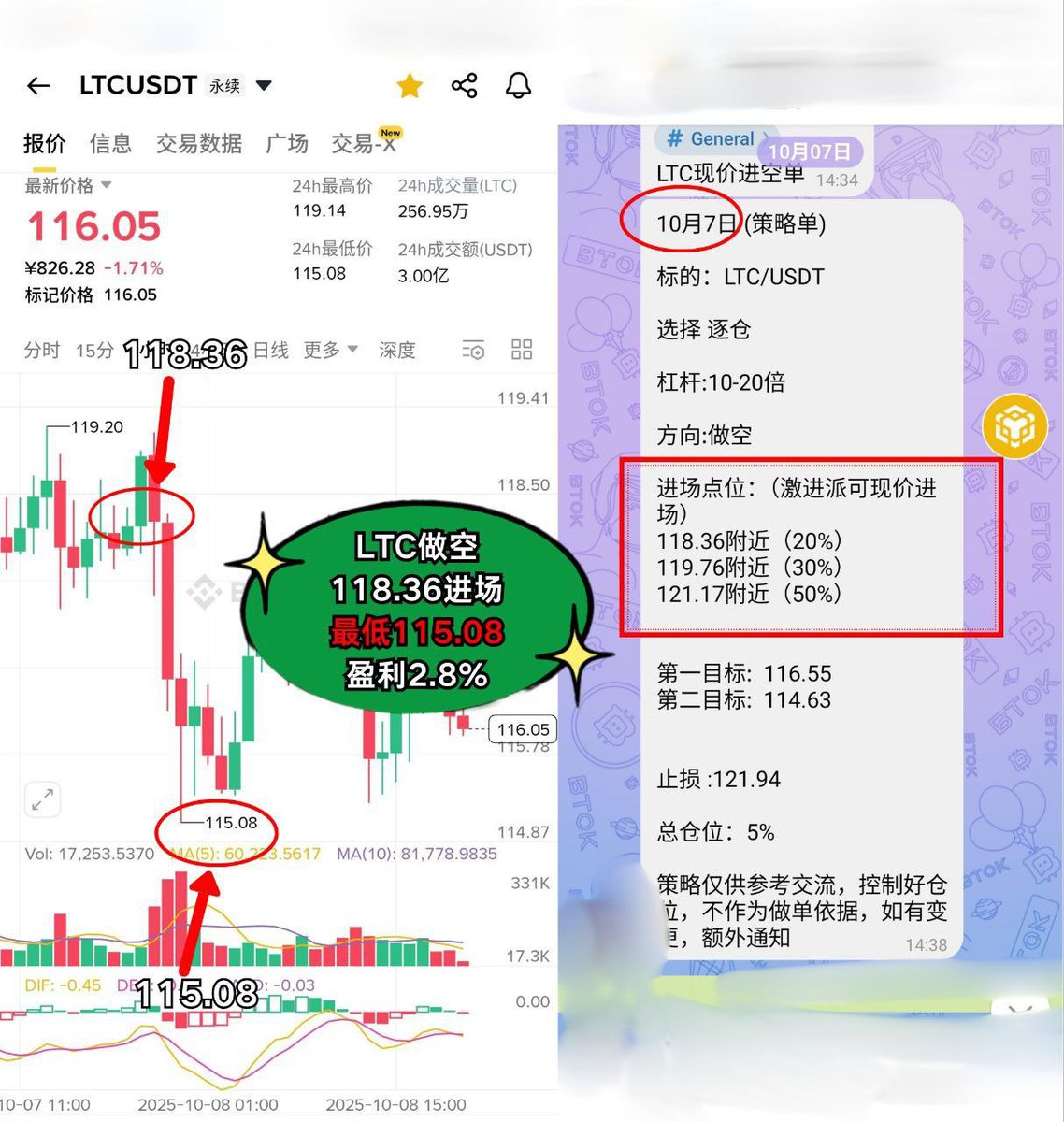 💎 $LTC 同步开空118.36,果断止盈于115.08,再收2.8%涨幅,节奏稳控!