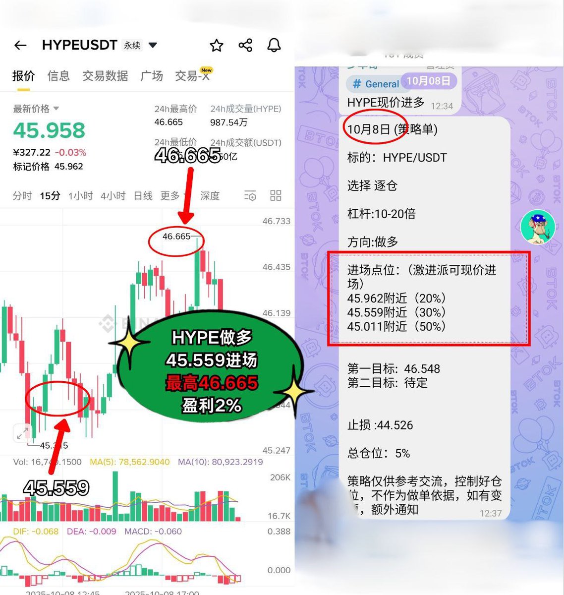 💎 $HYPE 多头反击,45.559进场,46.665高点撤离,2%利润轻松入袋!
