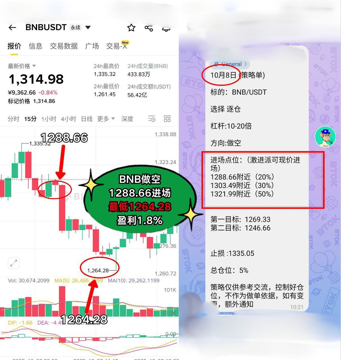 💎 $BNB 空单1288.66入场,1264.28离场,1.8%稳健收益,步步为赢!