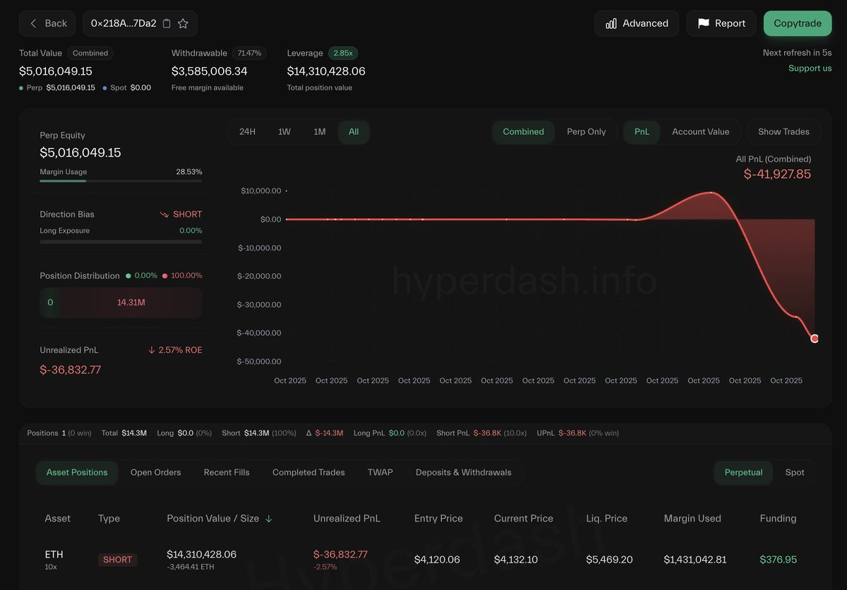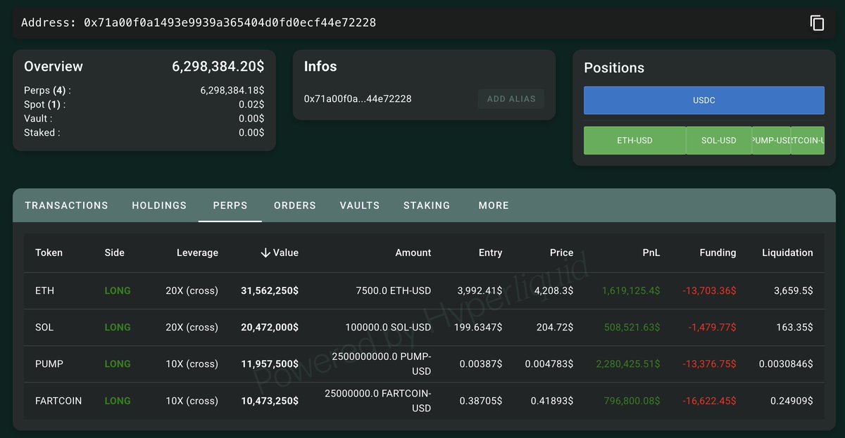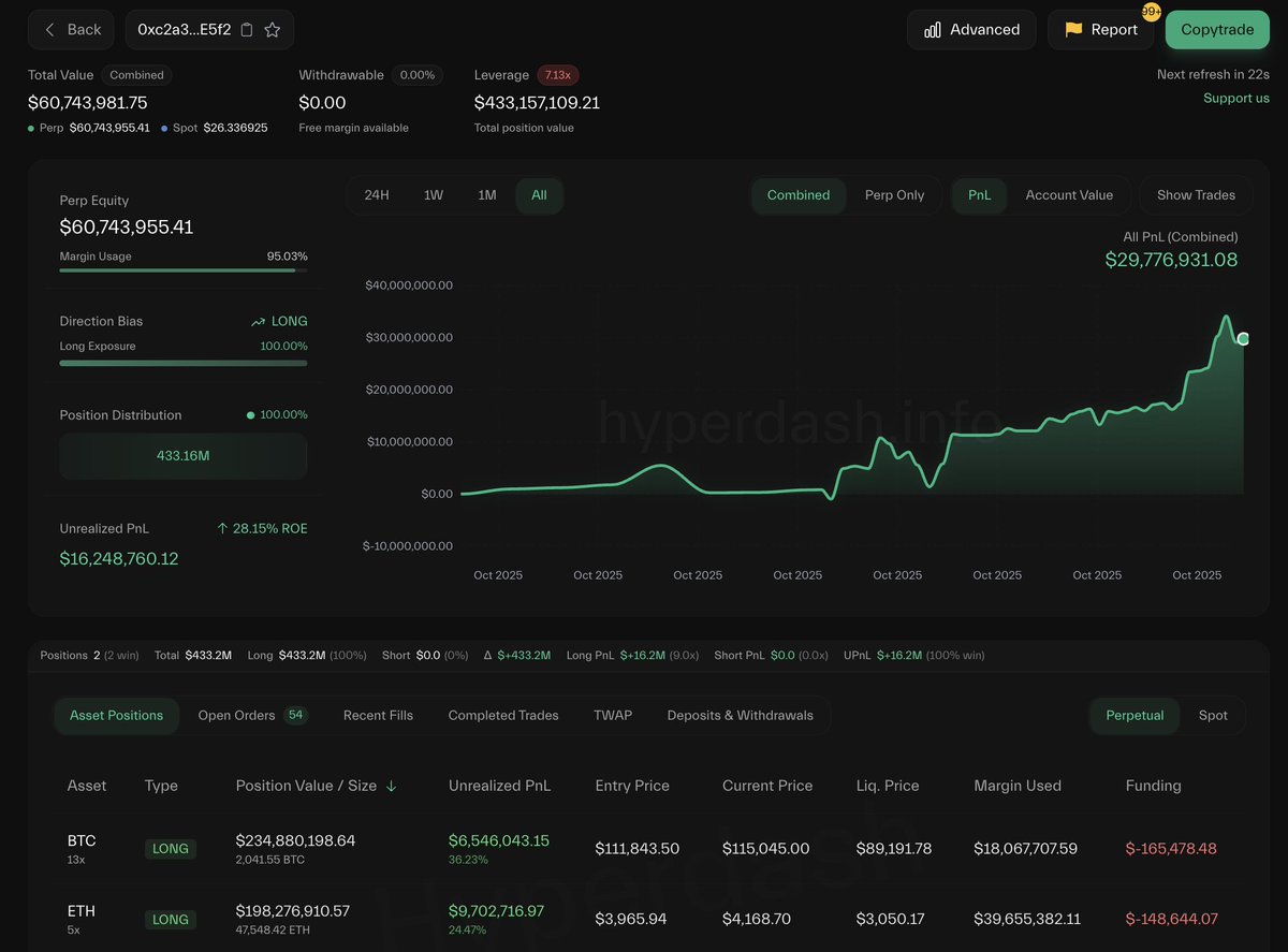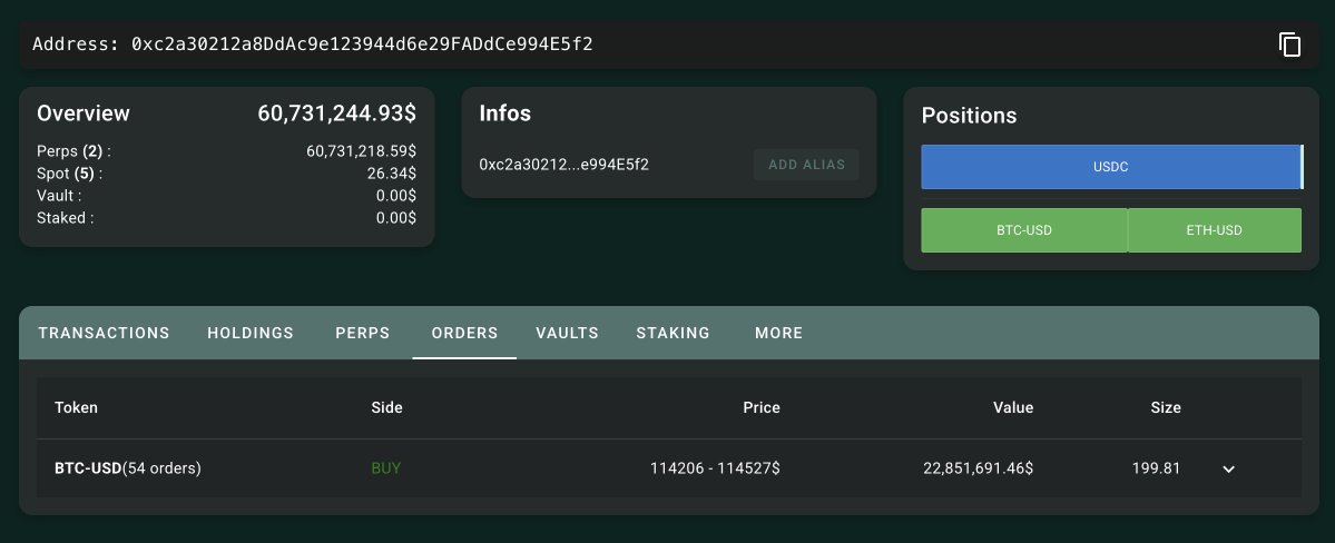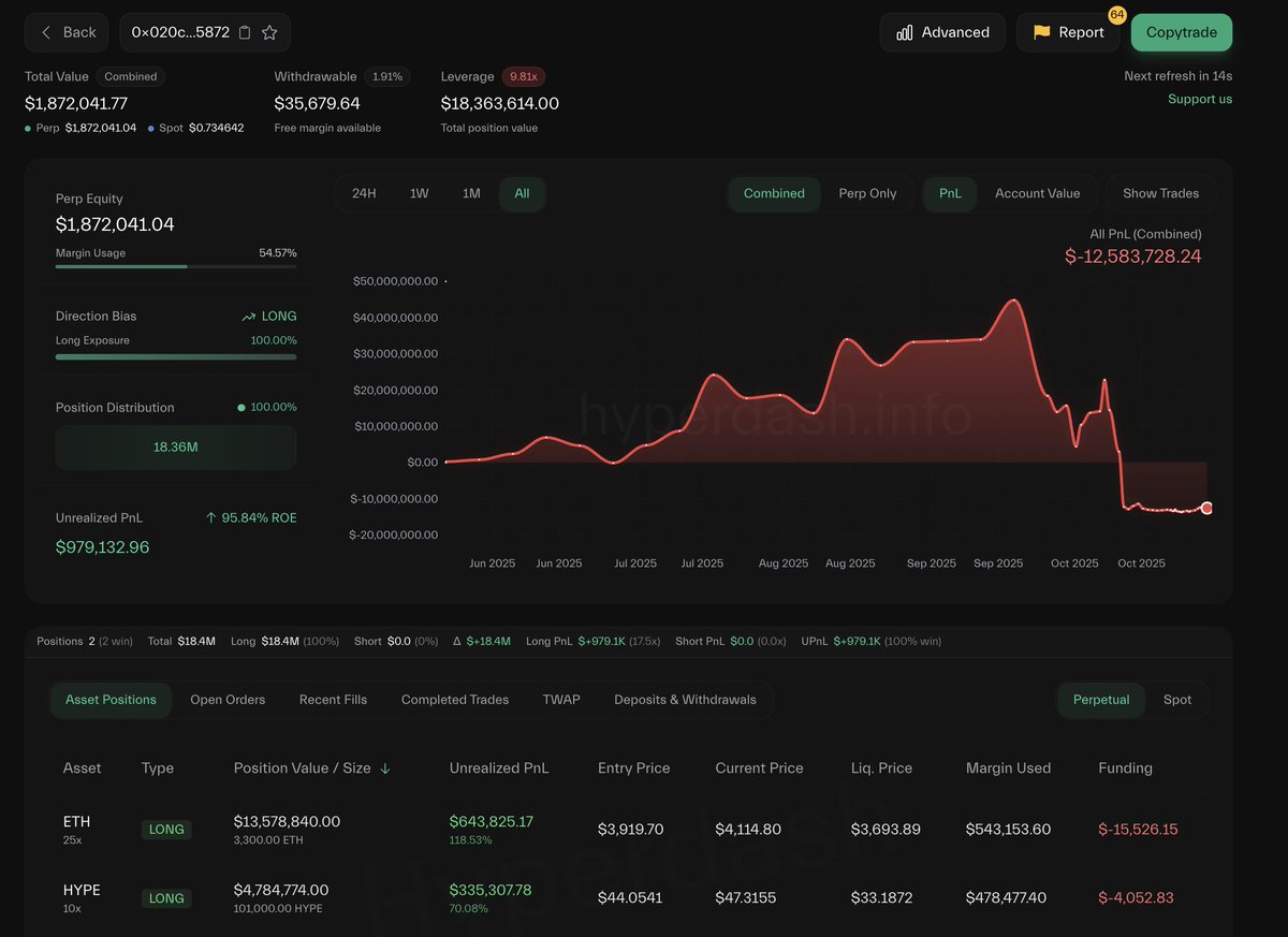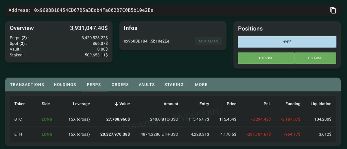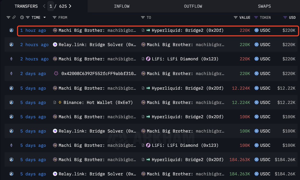 Machi Big Brother(@machibigbrother) 刚刚将另外 22 万美元 USDC 存入 #Hyperliquid,增加了他的 $HYPE 和 $ETH 多头头寸。