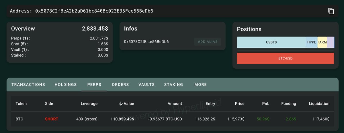 他刚刚获得了 1,854.54 $USDC 的推荐奖励,并开设了 0.96 $BTC(111K 美元)的 40 倍空头。