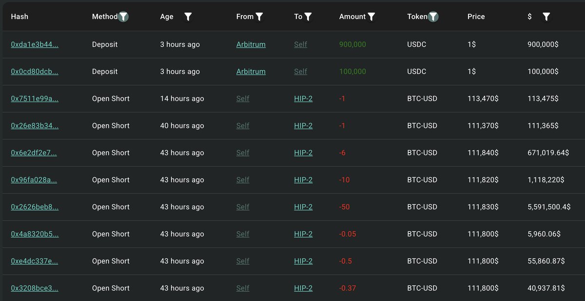 为了避免清算,他又将 100 万美元 USDC 存入 Hyperliquid。