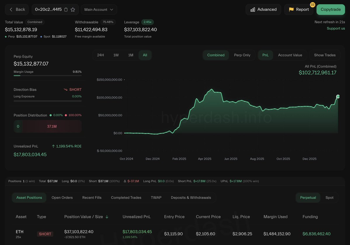 他刚刚又向 Hyperliquid 存入了 25 万美元 USDC,以继续渴望 ETH 和 HYPE。