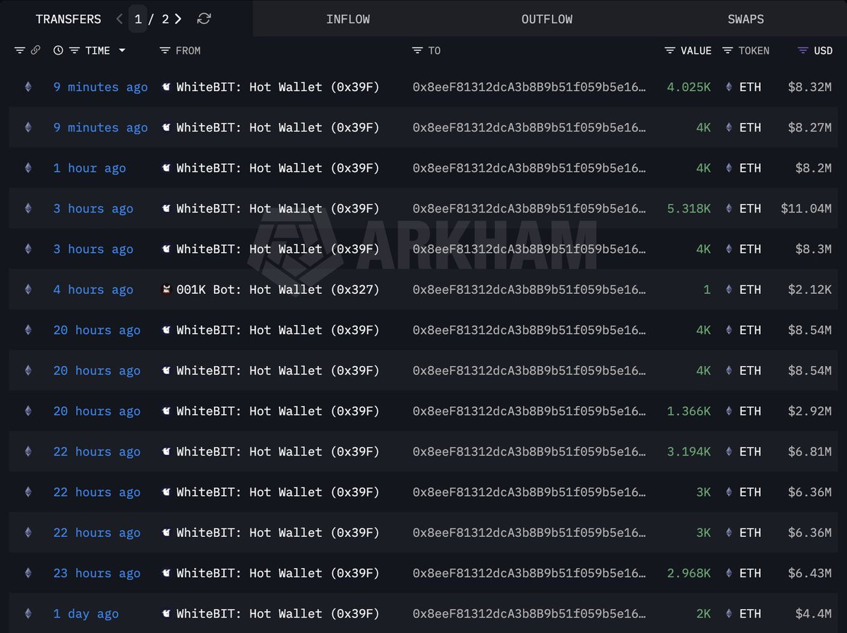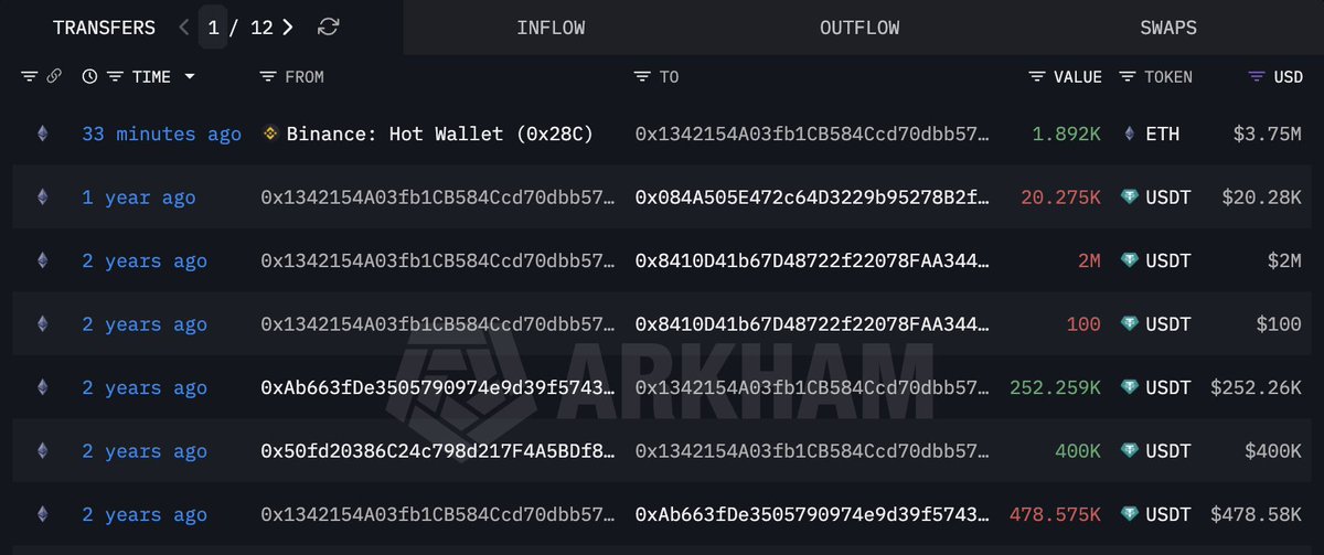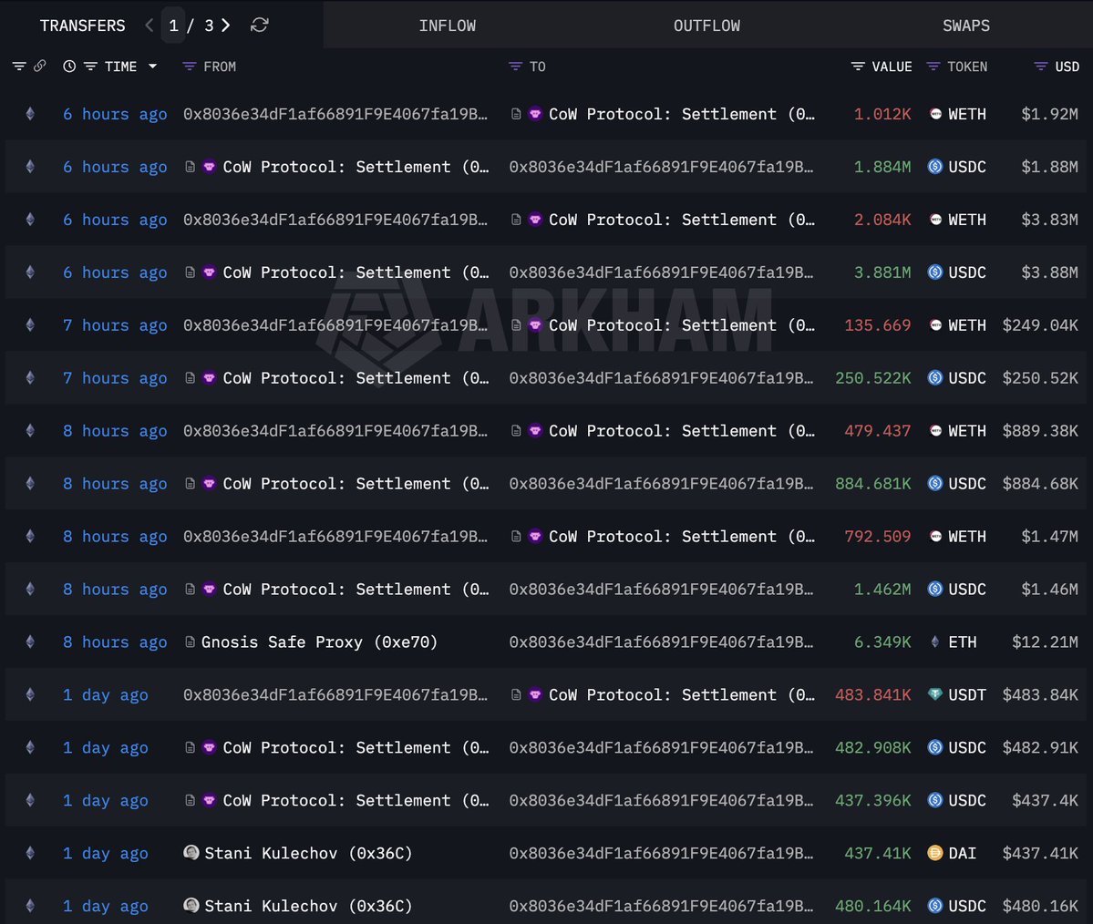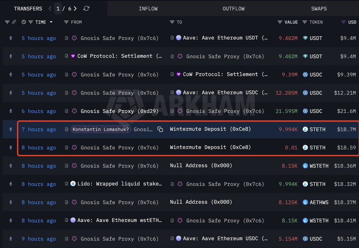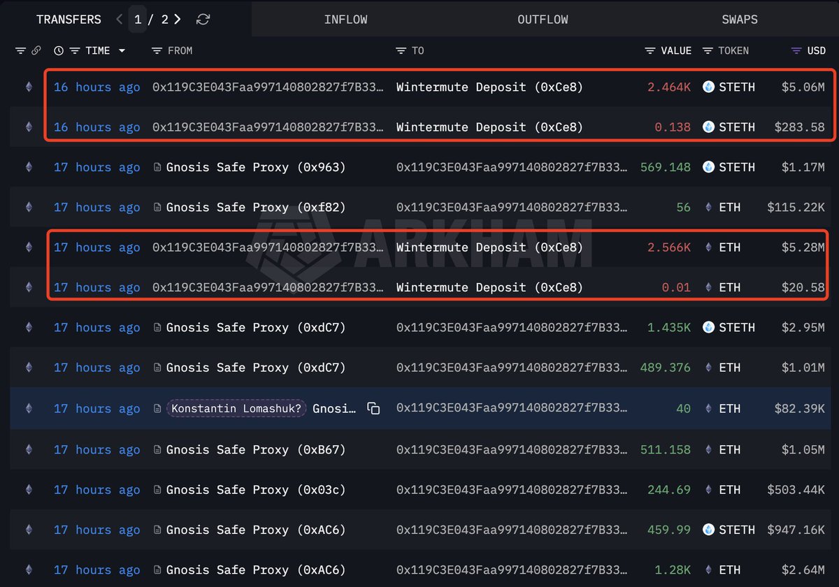 两个可能与他有关的钱包向 Wintermute 发送了 12,458 $stETH(2376 万美元)和 2,566 $ETH(538 万美元)。
