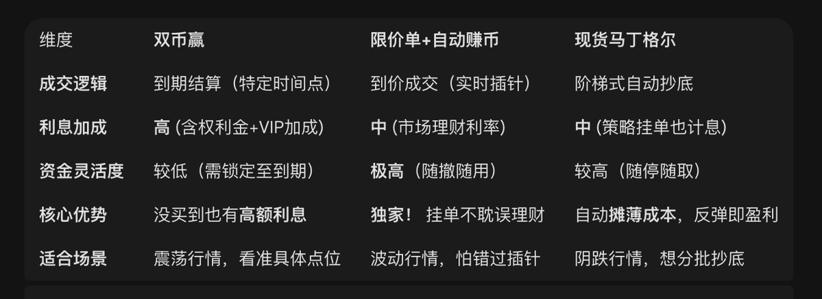 1️⃣ 双币赢:设定 5 万刀买入,买不到也拿 15% 年化收益,VIP 更有加成!
