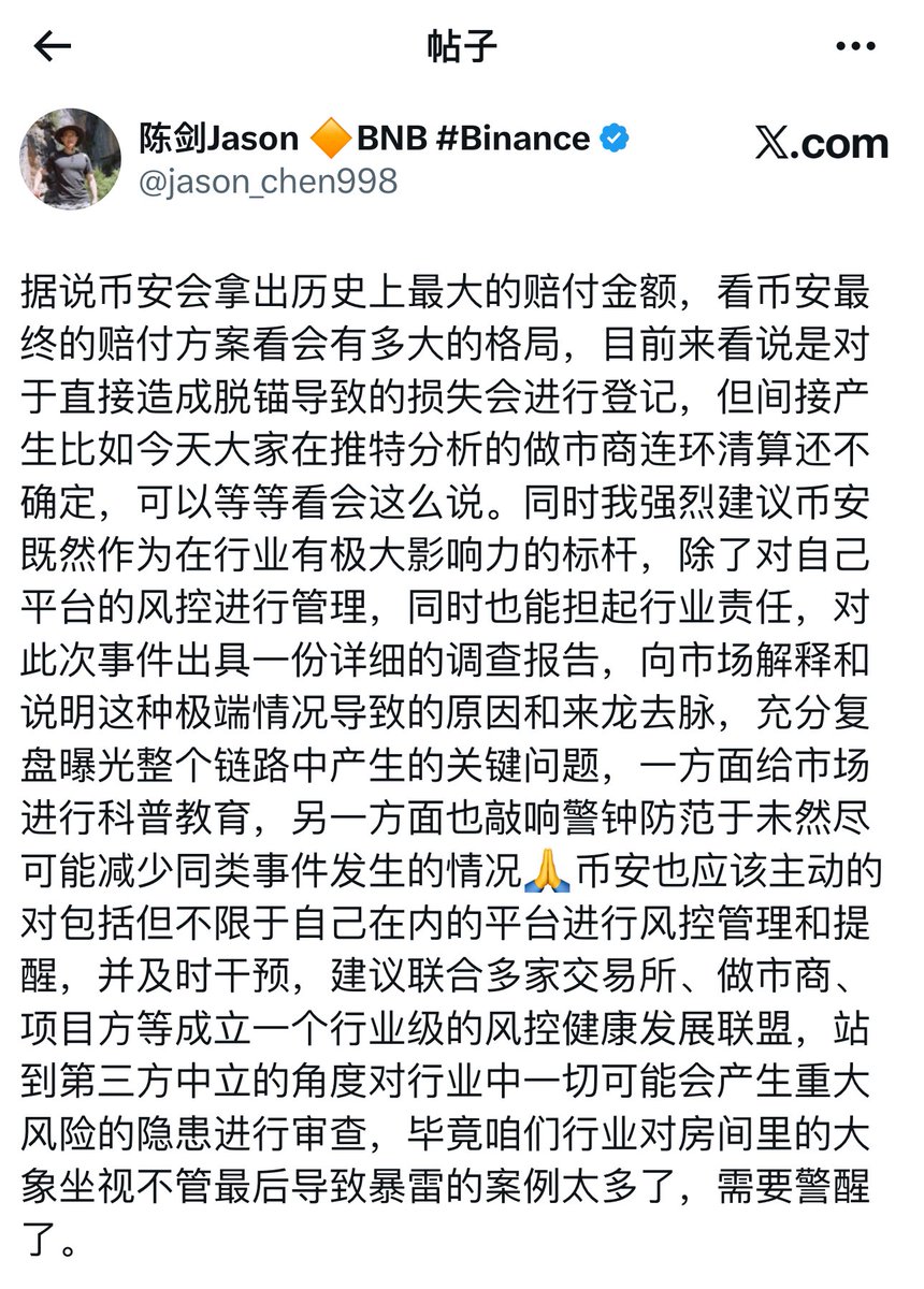 币安公告说会拿出最大的诚意,去赔付usde脱锚给用户造成的直接损失。