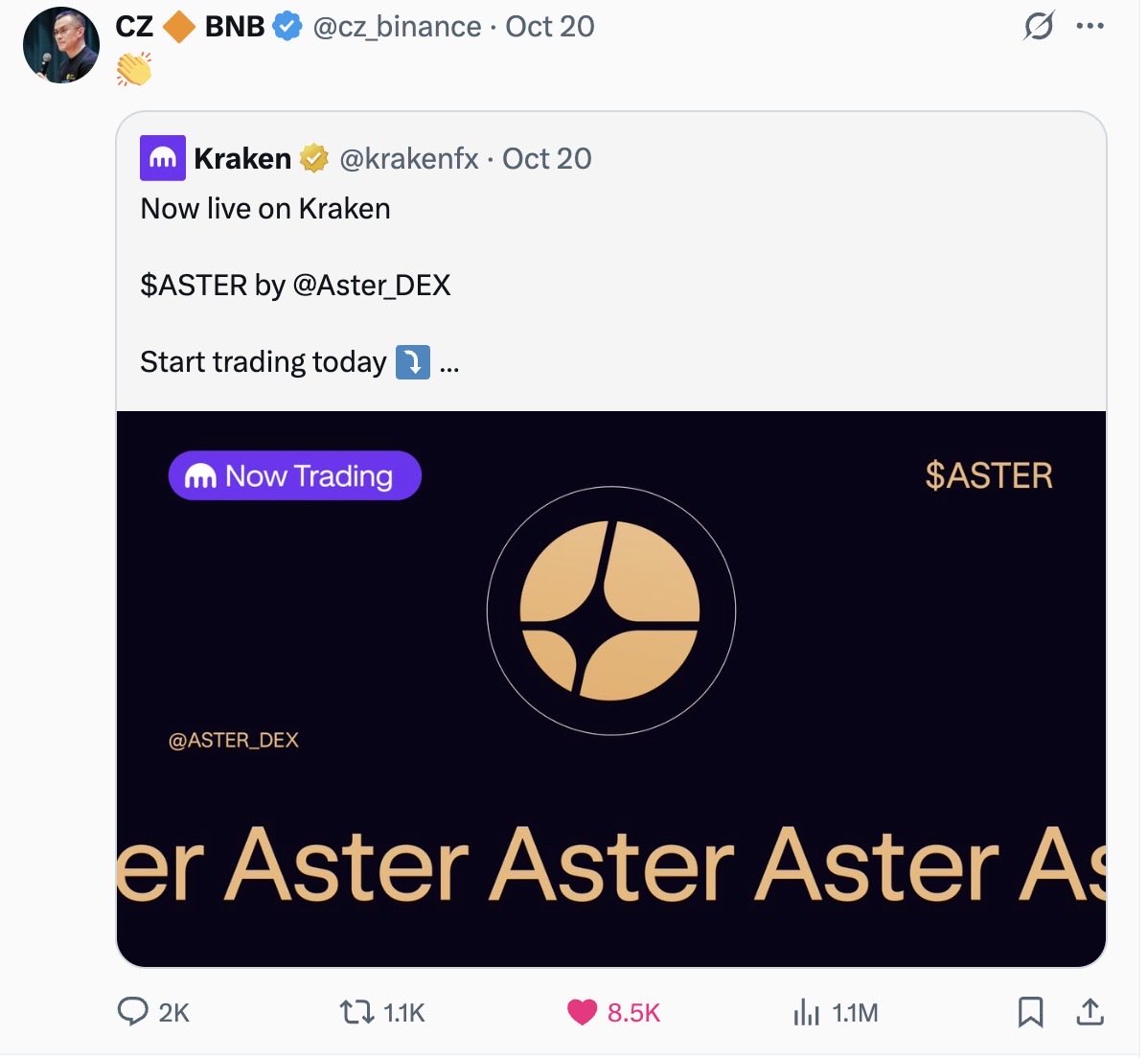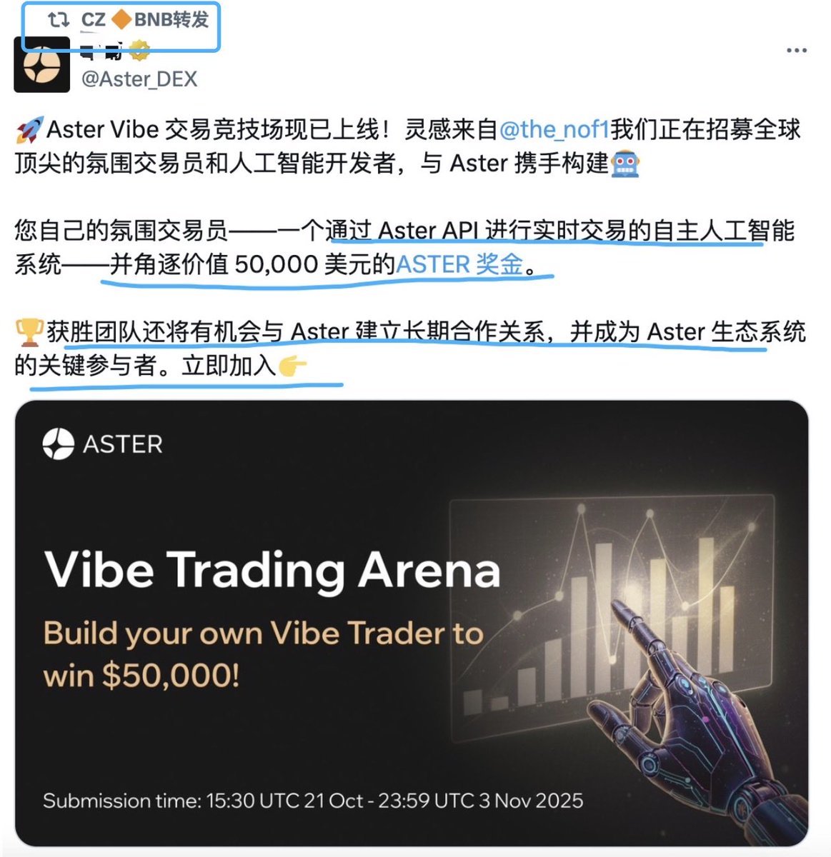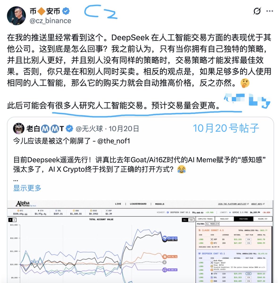 就翻到了,原来人家 @cz_binance 2天之前就发了关于人工智能交易的帖子。(btw:cz最近2天之内转发/发布了aster 3-4条相关帖子)