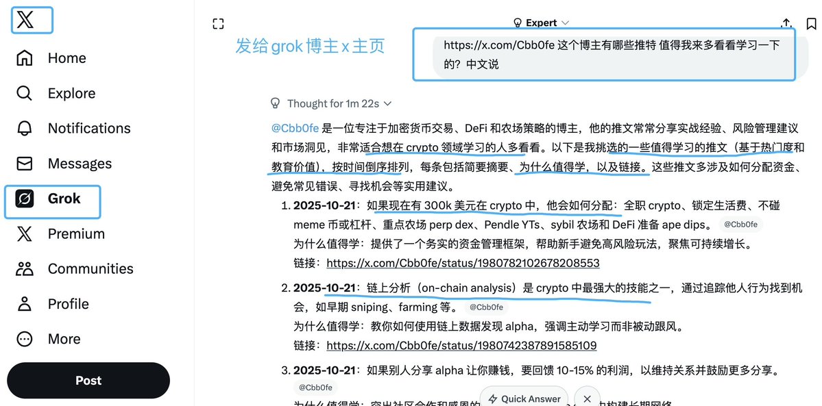 如何利用马斯克的X内置的人工智能grok,快速学习查找海外博主的干货知识。