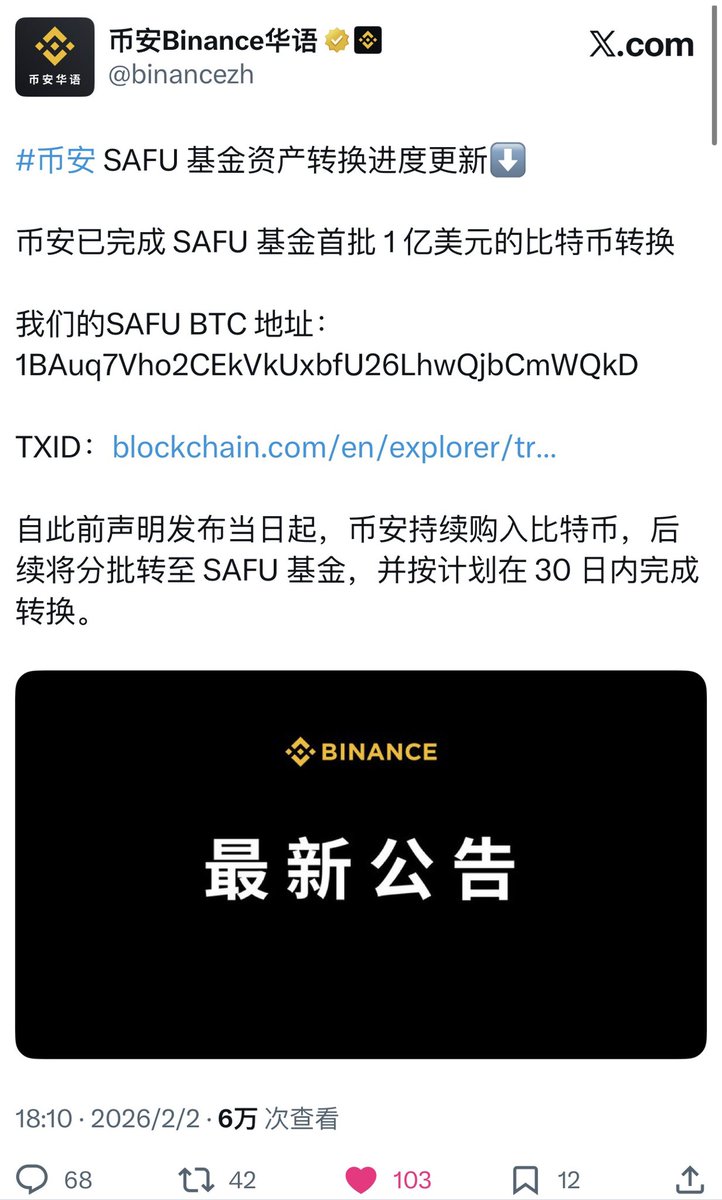 币安 @binancezh 周一上班了,就守信开始用SAFU基金买买买了。一上来,就买了10亿美金总资金的10%。一亿美金(7亿人民币)买了1315个 $BTC。