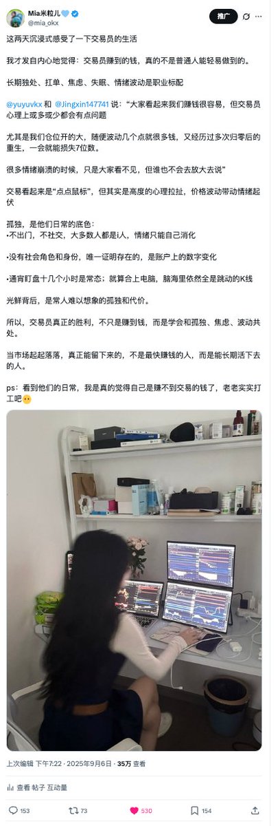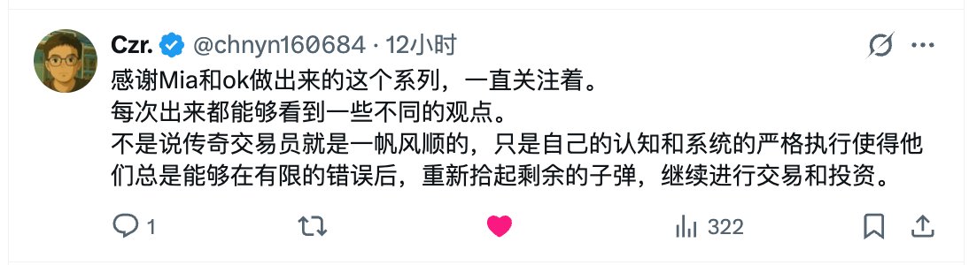 从今年一月到现在,已经做了快40期采访了 但《对话交易员》这六期深度访谈,是我印象最深刻的 在每一场对谈都1-2个小时的时间里,提到过去的经历,不止一位交易员在访谈当中哽咽,以及需要多次停下调整心情再继续 作为一个甚至没有经历过熊市的web3新人,我不知道交易到底是一条多难的路 我只知道身边赚钱故事太多,让大家都觉得暴富这个事情轻而易举,而让很多人失去了对于市场的敬畏 和他们成为朋友,深度了解他们的生活之后,我写下了那篇《交易员的心理问题》,引起了大量的共鸣 你们所看到的一夜暴富,其实都是经历了无数个独自崩溃的深夜熬过来的,5年、10年如一日的孤独与坚持,无一例外的经历过高强度的系统性的读书与学习 所以做采访不是为了宣扬暴富故事,而是希望大家能看到这些成功者的来时路 在这个过程中不乏有迷茫和失败的时候,看看他们迷茫时如何找寻胜利方向,以及失败时我们能从中吸取的教训 当然也能在你快要放弃时给你打一针强心剂,或是想要入场时,先看看自己是否能承担这样的折磨与寂寞,是否具备这样的强大内心 最后,放一句我的采访开场: 欢迎来到 OKX《对话交易员》系列。 在这里,我们将采访100位知名交易员,和他们一起聊聊 从第一笔交易的心跳,到交易策略的逻辑,再到市场周期的起伏。 每一位交易员背后,都有独特的故事和方法论。 有人在一夜之间归零,也有人逆风翻盘; 有人靠盘感操作,有人坚持系统。 但他们都有一个共同点:在市场的波动中活下来,并找到属于自己的胜利方式。 感谢大家喜欢,我会一直坚持做下去,第一目标 对话100位交易员!