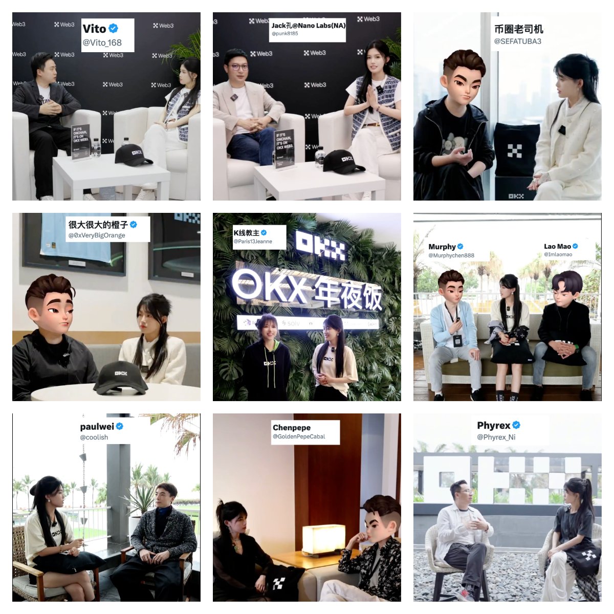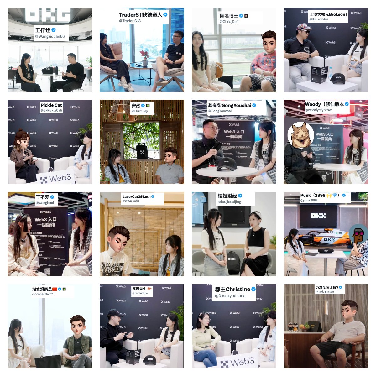 应大家要求,整理了一下在OKX做过的近40期的大佬视频专访到这篇帖子中。 这篇内容我会一直置顶并持续更新 做到 OKX《对话交易员》系列的第 100 期。 当时做采访的初衷,其实很简单 作为一个刚入圈的新人,我对那些在行业里做出成绩的人充满了敬佩,也希望自己能从他们的经验中学习到些什么 同时我想屏幕前的大家,也会有类似需求,以及因此受益。 后来我陆续采访了这个行业各种类型的人: 做空投、链上交易、创业、做代理、做策略、宏观、量化交易、挖矿、二级交易,甚至还有传统金融大v。 他们的经历各不相同,但共同点是: 无论市场怎样波动,他们都能找到属于自己的「胜利方式」,从而活下来。 加入 OKX 之后,我更深刻地理解了这里的长期主义价值观。 当潮水退去,真正能留下的,不是短暂的热度,而是那些值得被记录的人与故事还有经验。 所以我希望通过这些深度专访, 去留下那些真正能不惧牛熊、无论涨跌的成功经验 也希望你能从他们的故事里,找到属于自己的胜利方式💚 --------------------------------------------- 对话交易员 第0期:风无向 @0x0xfeng https://t.co/XGwhNDFend 对话交易员第一期:熬鹰 @thankUcrypto https://t.co/VoyG8qrcN7 对话交易员复采熬鹰:https://t.co/QlAEvHWitc 对话交易员第二期:如果我不懂 @butaidongjiaoyi https://t.co/5STGFpEem0 对话交易员第三期:天晴 @TQLB11 https://t.co/TXZd9emaJD 对话交易员第四期:予与 @yuyuvkx https://t.co/WsgWZZva0h 对话交易员第五期:东方高盛诺亚 @NoahLuba518 https://t.co/zSBqvZcB6A 《OKX的朋友们》对话系列: 《对话》第一期:倪大 @Phyrex_Ni https://t.co/NsejEd5359 《对话》第二期:k线教主 @Paris13Jeanne https://t.co/rbJnrSiHky 《对话》第三期:魏神 @coolish https://t.co/e036kCeCxi 《对话》第四期:Murphy @Murphychen888、猫叔 @Imlaomao https://t.co/A8Djo9cKfP 《对话》第五期:chenpepe @Nyenchenpepe https://t.co/MUT1VTGnZG 《对话》第六期:大橙子 @0xVeryBigOrange https://t.co/MEnpdhd4yP 《对话》第七期:币圈老司机 @SEFATUBA3 https://t.co/OQwuI4NcMC 《对话》第八期:孔剑平 @punk8185 https://t.co/FreslCfuQD 《对话》第九期:Vito @Vito_168 https://t.co/3jXvGLJmMu 《对话》第十期:郡主 @0xsexybanana https://t.co/qEq2p1FWvJ 《对话》第十一期:区块先生 @mrblocktw https://t.co/SMU98nADjR 《对话》第十二期:潜水观察员 @connectfarm1 https://t.co/3VUeJGZSmF 《对话》第十三期:土澳大师兄 @BroLeonAus https://t.co/dkWL47nktv 《对话》第十四期:匿名博士 @Chris_Defi https://t.co/OhI2Zdel3A 《对话》第十五期:黄瓜猫 @0xPickleCati https://t.co/dlpDcuB3nv 《对话》第十六期:Woody @woodycryptow https://t.co/WgYKA9tY7q 《对话》第十七期:安然 @FluxGray https://t.co/pqdpg6ncEN 《对话》第十八期:龚老师 @GongYouchai https://t.co/8d9u1zb4xh 《对话》第十九期:王不爱 @wangbuai https://t.co/PacVltUjrT 《对话》第二十期:镭射猫 @BitCloutCat https://t.co/mwx5bUGyb4 《对话》第二十一期 楼姐财经: @loujiecaijing https://t.co/H3Ze4nHCig 《对话》第二十二期:2898 @punk2898 https://t.co/4djSNsoiaf 《对话》第二十三期:缺德道人 @Trader_S18 https://t.co/C0wlwj3Kxh 《对话》第二十四期:王梓铨 @Wangziquan66 https://t.co/cRsyq8JdPt
