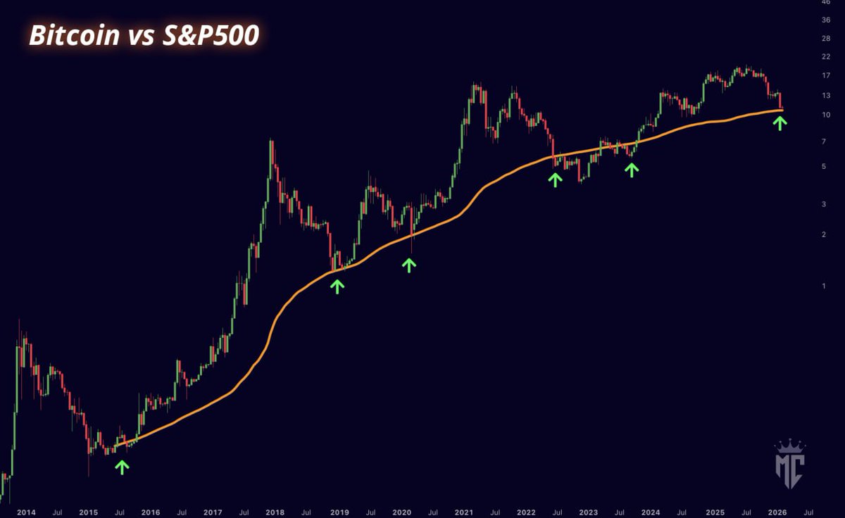 🚨 比特币被低估 我们可以清楚地看到,比特币已经与股市脱钩了。 每当BTC/SPX货币对跌破200W MA时,历史上都是积累比特币的好时机。 我们现在随时都会进入吸筹区间。