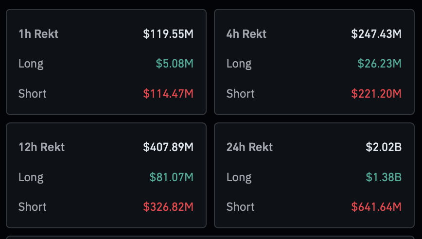 突发新闻:过去 4 小时内清算了价值 2.2 亿美元的加密货币空头。