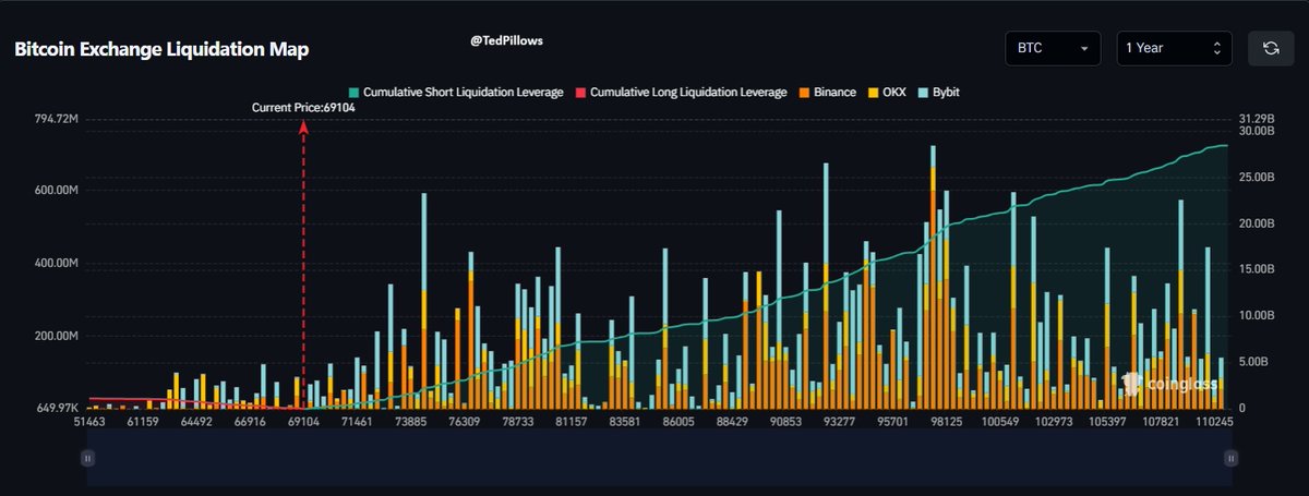 如果比特币上涨 15%,价值 5,4B 美元的空头将被清算。 如果比特币下跌 15%,价值 1,1B 美元的多头将被清算。 哪一个先发生? 👇