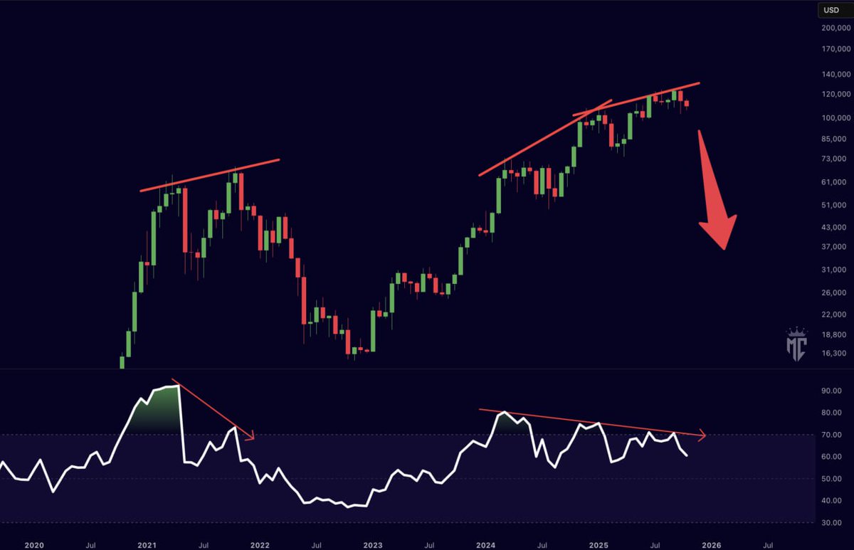 Bitcoin is showing more and more signs of having topped out… This weekly close will be crucial. https://t.co/DgNVnn5DiW