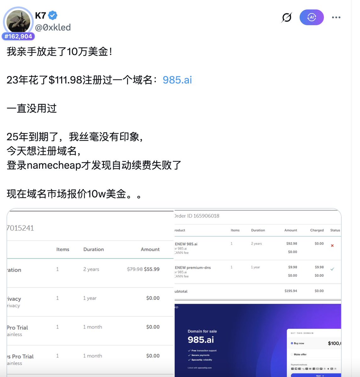 这位朋友在23年花了111.98美金注册了一个后缀为AI的域名