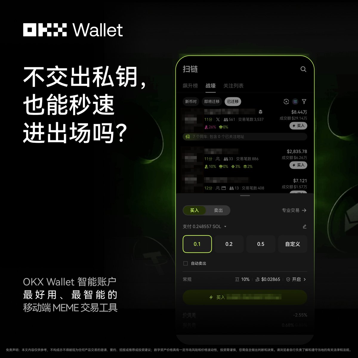 不交出私钥,也能秒速进出场吗? 当然可以!这应是你掌控交易的自由。 OKX Wallet 智能账户,发现即狙击,预设即撤退;安全与迅速,从此一体。 💡请更新 App 至 6.157.0 版本进行体验