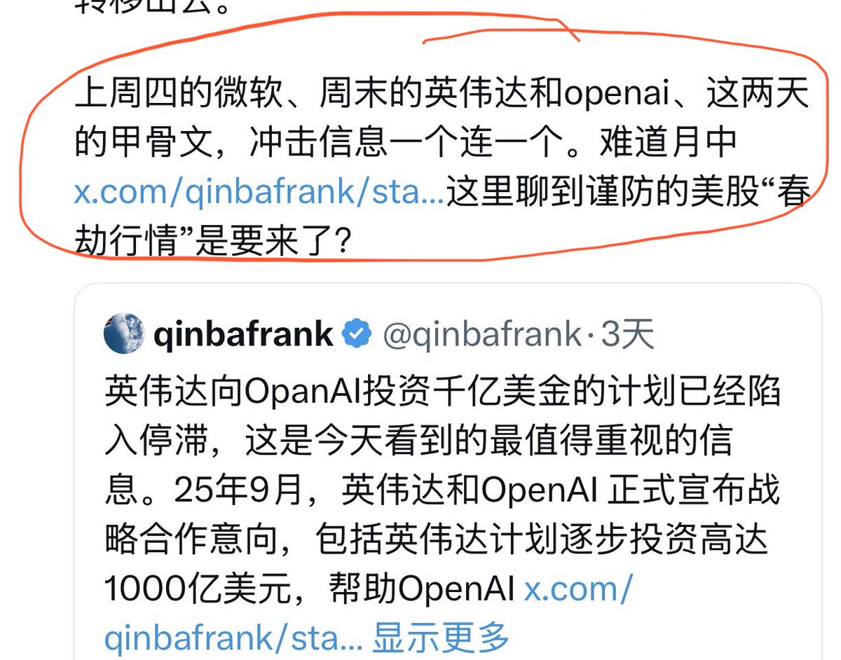 上周四的微软、周末的英伟达和openai、这两天的甲骨文,冲击信息一个连一个。难道月中https://t.co/qryJKqyCYY这里聊到谨防的美股“春劫行情”是要来了?