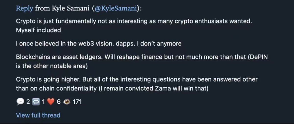 更唏嘘的是Kyle那条被删掉的推文,他说“加密货币根本就没有很多人(包括我自己)曾经想象的那么有趣。我曾经相信 Web3 的愿景,相信 dApps。现在我不信了。区块链本质上就是资产账本。它们会重塑金融,但也就仅此而已,不会再多太多。DePIN 是另一个值得注意的领域。加密货币会继续变好,但所有真正有趣的问题都已经有了答案,除了链上隐私/机密性这个问题之外。”