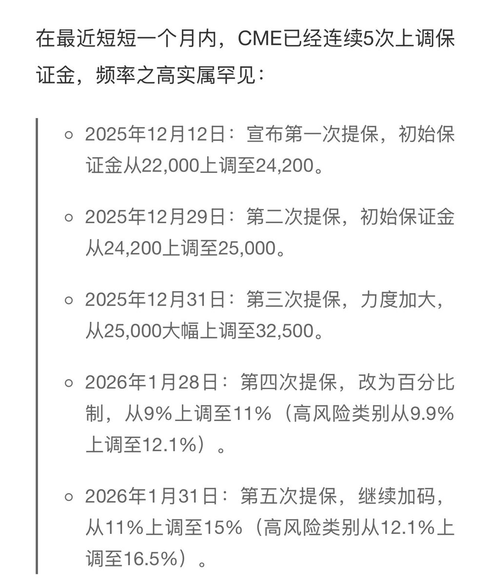 白银的暴跌最直接的原因应该是还是CME再次出手了,本周CME在1月内第二次大幅上调百分比率(从9%→11%)29号开始生效,1月13日CME已把白银保证金从固定美元金额全面转为百分比模式(初始白银设为9%)。但本周再次上调保证金比率,相当于保证金成本相比之前又增加了20-25%。