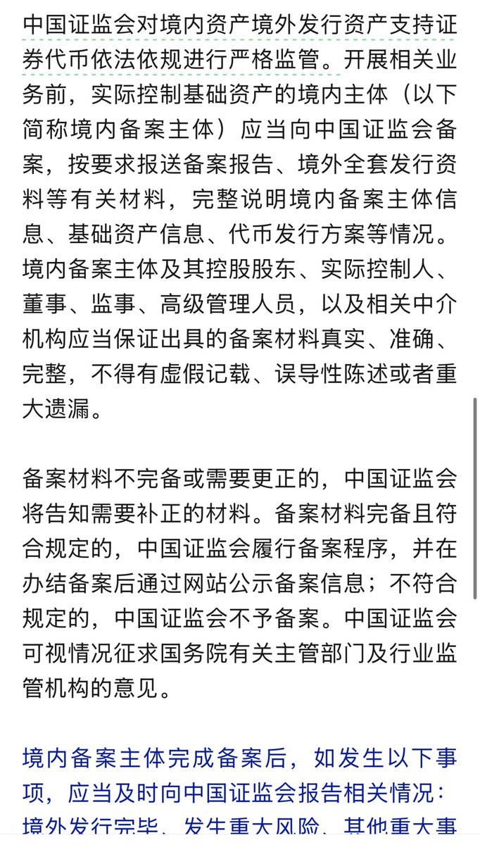 第二份证监会发布的境内资产境外发行资产支持证券代币监管文件里虽然也有很多严格条款,但是也明确了实际控制基础资产的境内主体,只要备案信息完整、准确、正确,其实是可以在境外发行资产支持证券代币的。