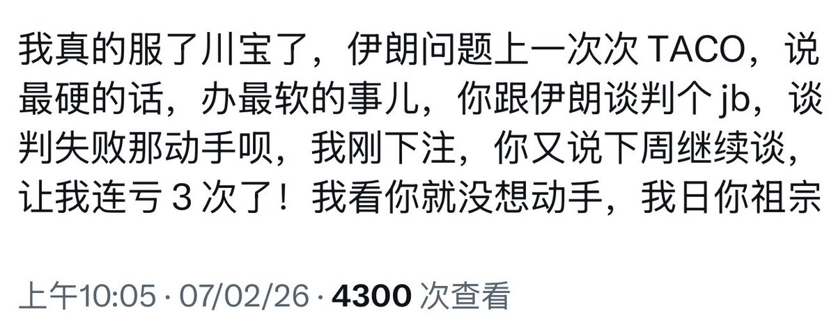 美伊在阿曼谈判,川普为啥迟迟不动手?要说到美伊在阿曼的谈判进展,实则没有进展。伊朗外长的表态就是注脚:就继续谈判达成了共识。川普表态下周继续谈。看到有人在聊到川普的不断TACO,忍不住再来聊聊伊朗动态,聊聊川普的心态: