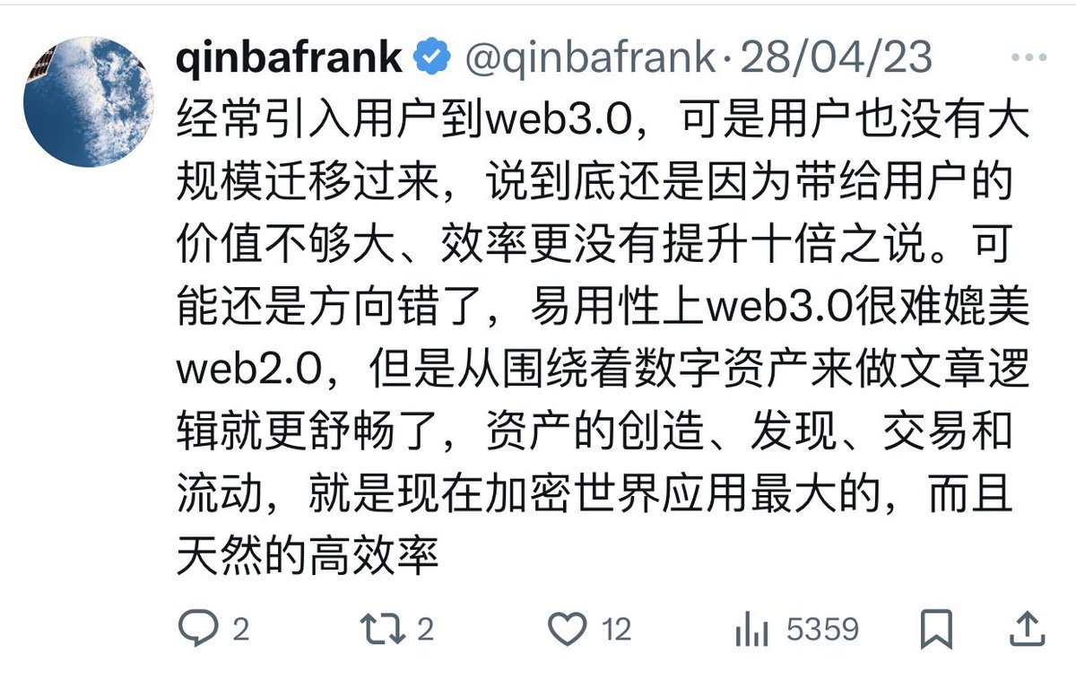 这其实跟去年8月份我在思考的一个暴论很一致:我们以前所期待的区块链技术能跟很多场景结合,原生的web3应用例如游戏、社交、电商甚至很多线下业务结合以期望带来真正的创新落地和价值创造,可能并不存在。区块链技术、代币经济、加密资产未来最大的应用场景并不是所期待的crypto原生的创新应用,而是来自两个场景: