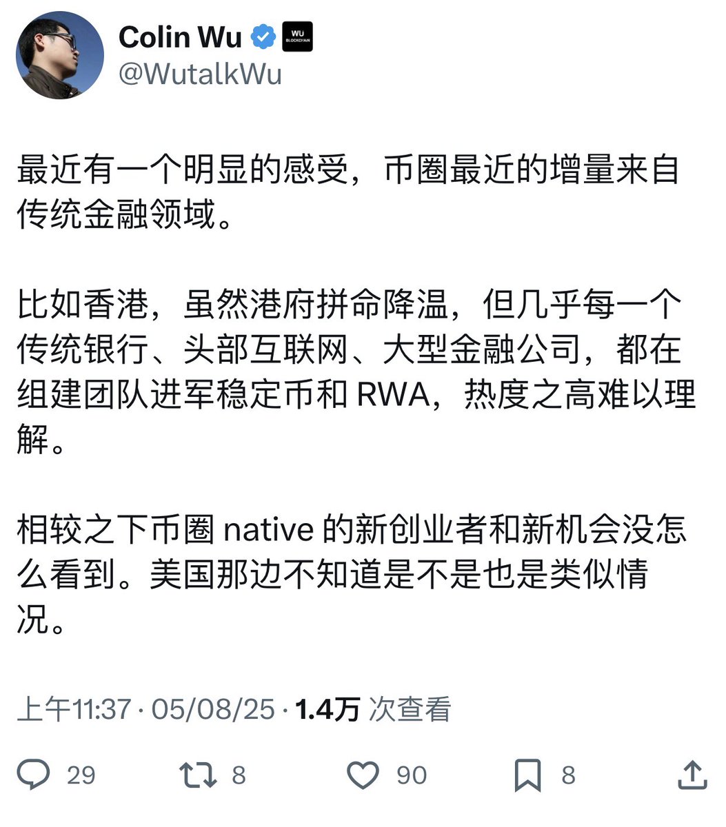 kyle在删掉的推文里说的加密重塑金融,就是两点:整个金融体系往链上迁移,各类资产也在往链上迁移。加密跟AI的结合是他没有提到的,而个人是看好的。不能说Kyle的离开不对,信心缺失低迷自然会选择其他领域。我自己过去一段时间精力大部分也在美股。但不会离开加密,仍然认为这里还有新的机会在孕育中。