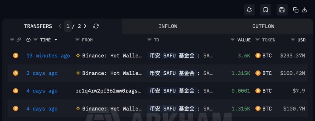 Binance SAFU 基金地址时隔两天再次买入 3600 $BTC !价值2.33亿美金