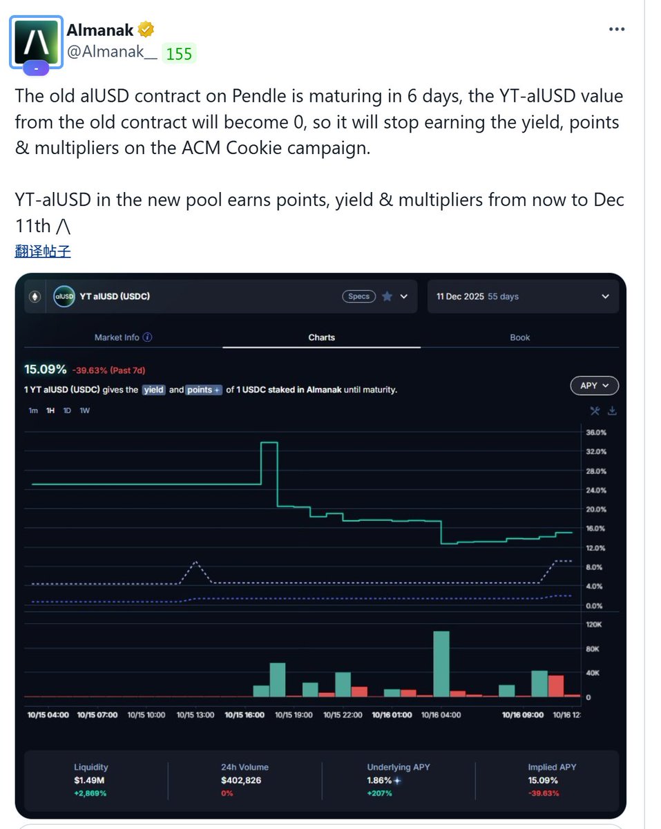>全新 Pendle 池已上线,包含将于 12 月 11 日 到期的 alUSD 合约(由 @pendle_fi 提供)