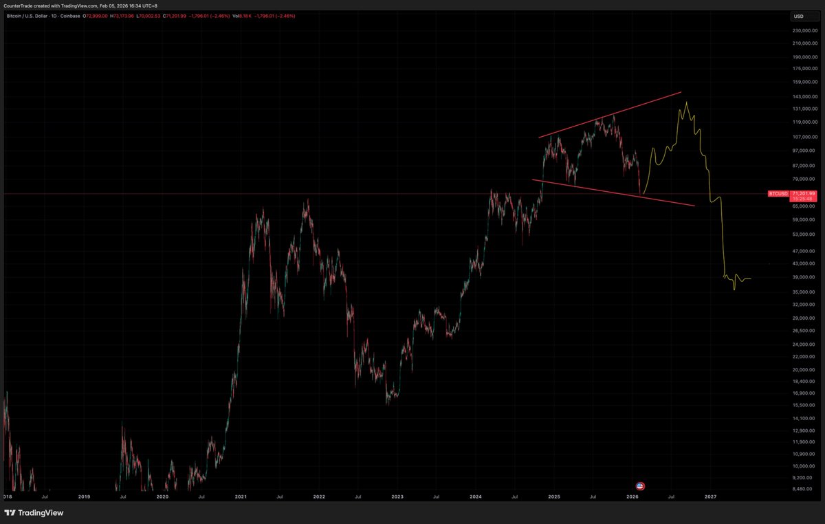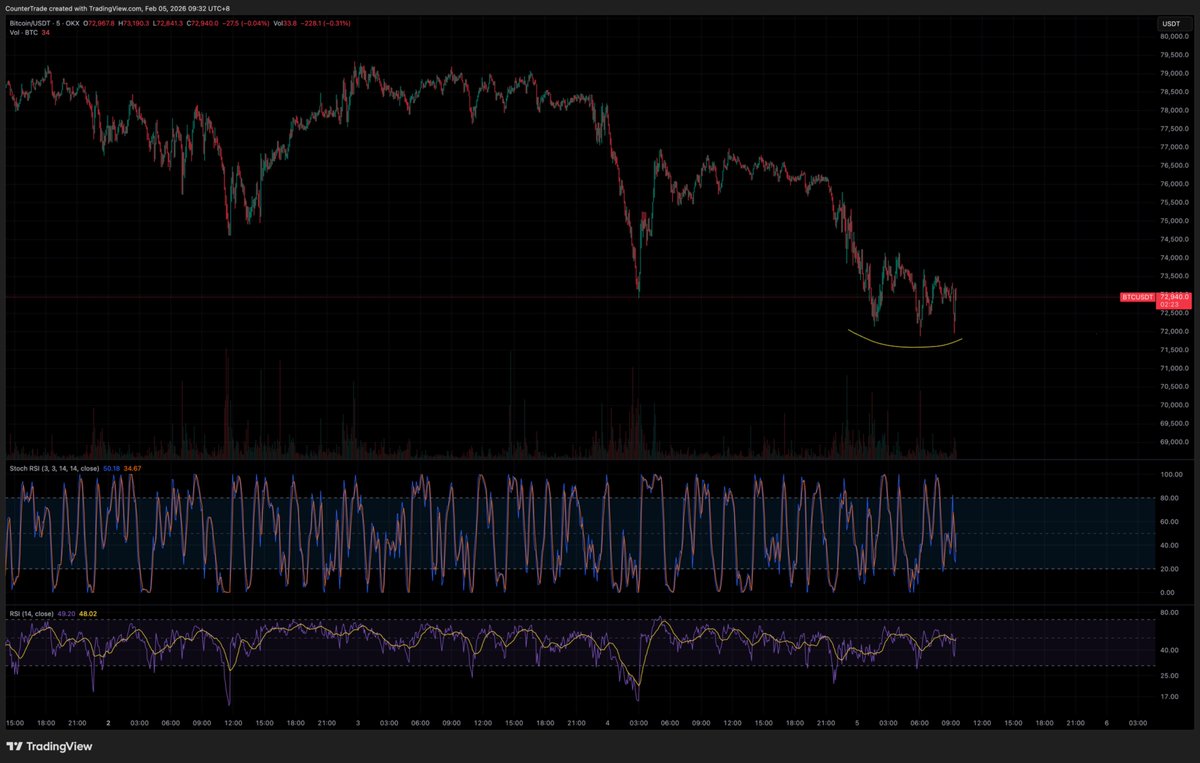 👍行情判断:被砍73-74k看到86-88k。到位后大概率还有一波回调到74-78k,形成三重底。然后3月开始暴涨到105-108k。长线来看如果126k是这轮牛市的高点,那么低点应该在-70%的地方,也就是40k左右。所以说熊市第二阶段会非常残酷。大部分机构甚至某家交易所要倒闭。
