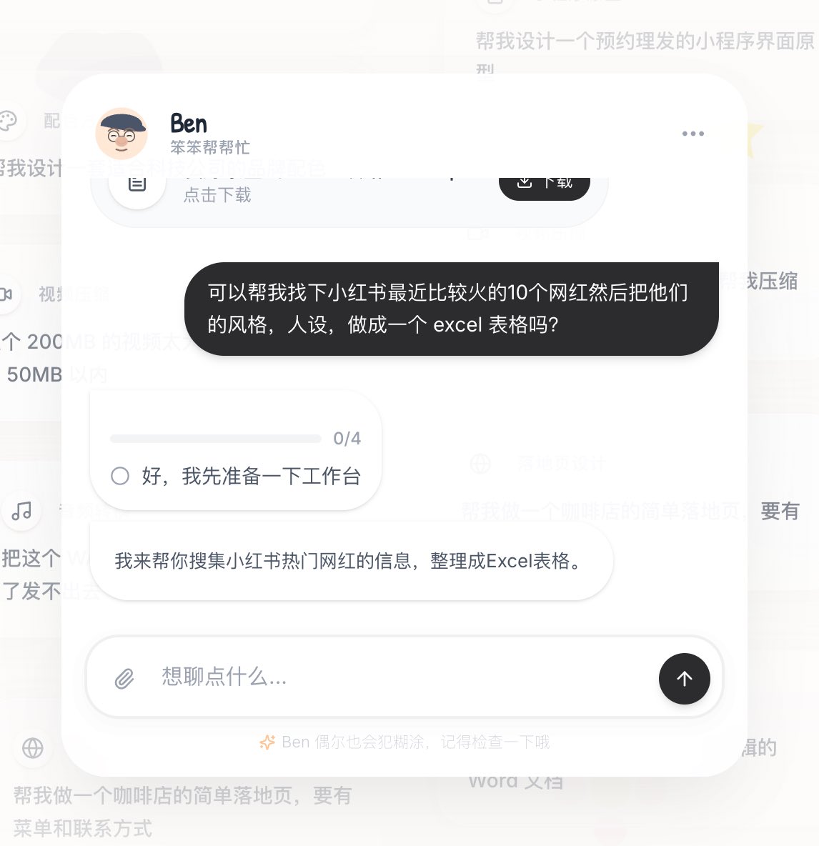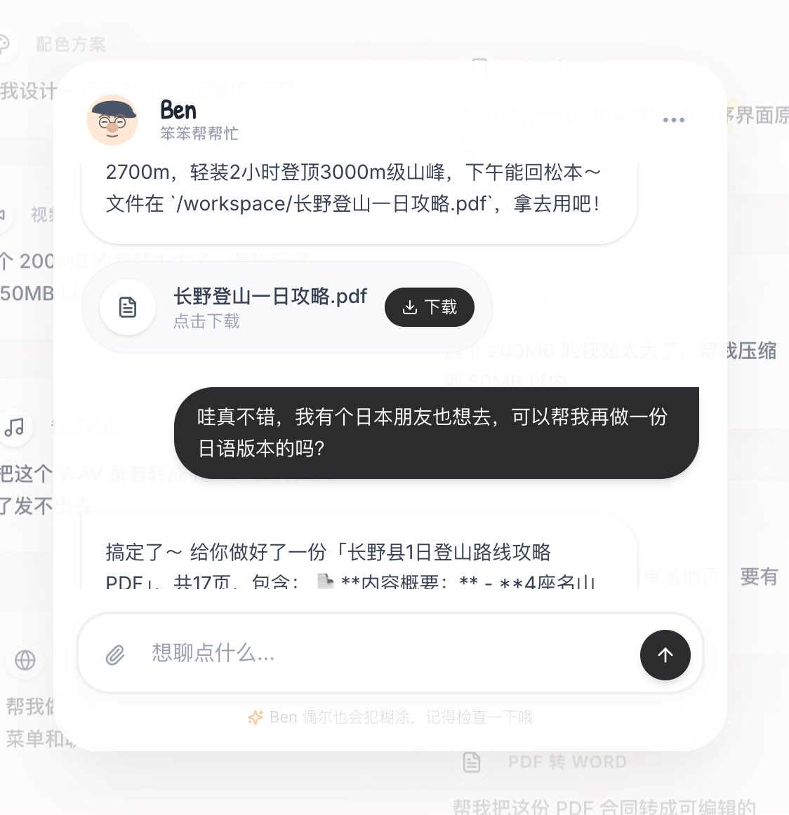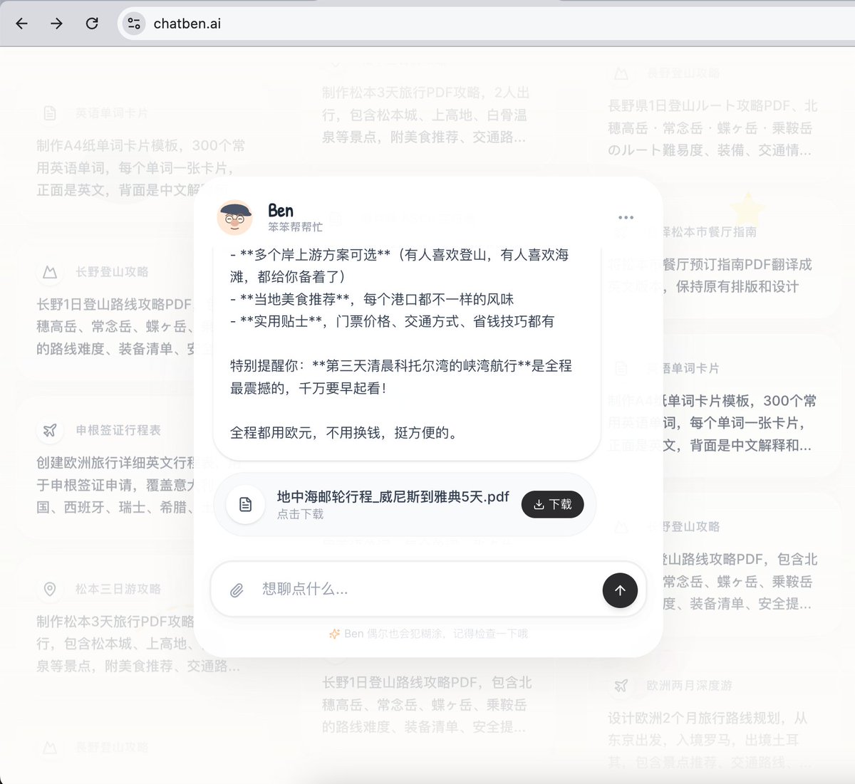 和大家正式介绍我的第四个 vibe 产品,https://t.co/JogVpGAaEO(笨笨帮帮忙),ben 是你的 AI 邻居,整天闲着没事儿愿意帮你点小忙,收你点小钱的小老头儿,你可以交代 ben 任何事情,小到做旅行规划,文件转换,签证申请材料,大到做公司网站,市场调研,学术研究,尽管展开想象力。Chatben 没有订阅制,ben 会愿意每天免费帮各位三个忙,多出来的任务,一口价 $1/件。