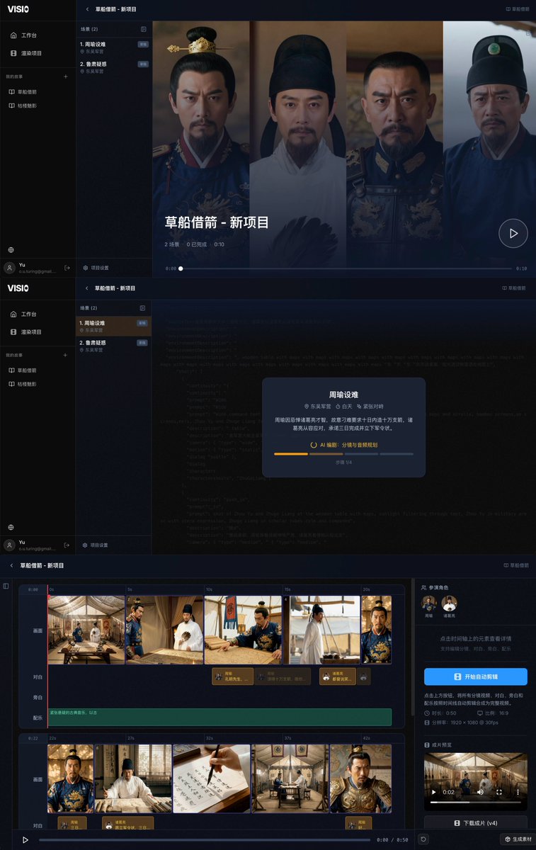 在全自动的前提下,VISI0 还同时支持修改画面描述,对白,旁白与配乐描述,修改音频资源在时间轴上的位置,并支持最后的剪辑成片等功能。