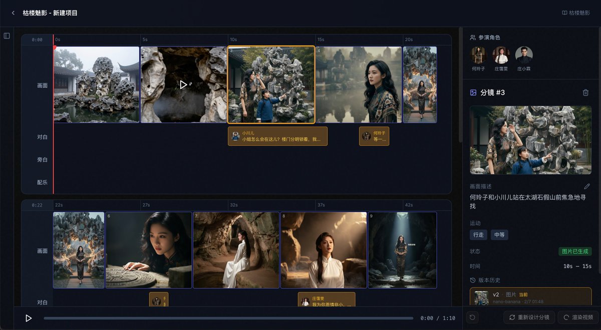 给 https://t.co/DboM5iwxds 新上线了富有情绪的 tts 模型 index-tts-2,现在自动生成素材的音轨有了质的飞跃!大家如果已经有了渲染项目可以回去点击生成对白或者生成旁白试试看。另外由于 nano banana pro API 实在太贵(半天跑了我几百刀)给 pro 用户换成了 nano banana... 结果根本看不出有什么区别,角色和服装仍然还是高度一致,做分镜足够了,速度还快了一大截!