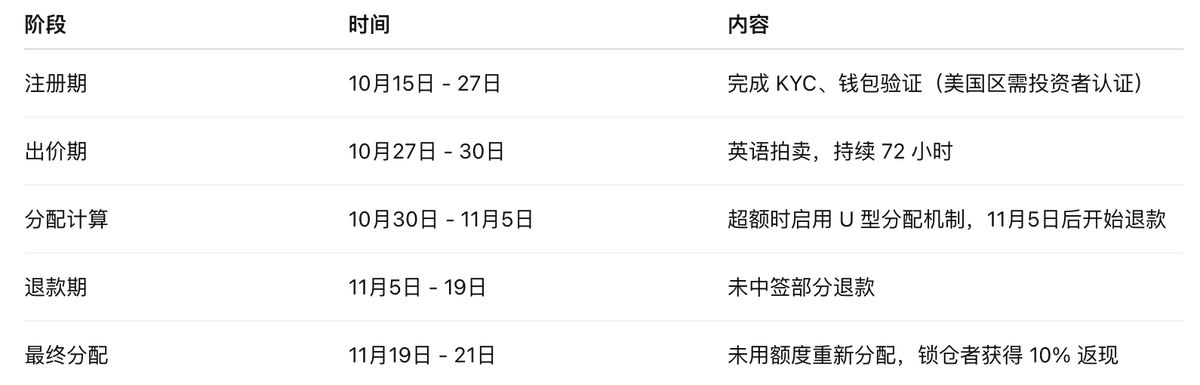 一句话省流:注册并完成 KYC → 出价(≥$2,650) → 可选 1 年锁仓享折扣 或不锁→ 等待拍卖结束与清算分配退回资金