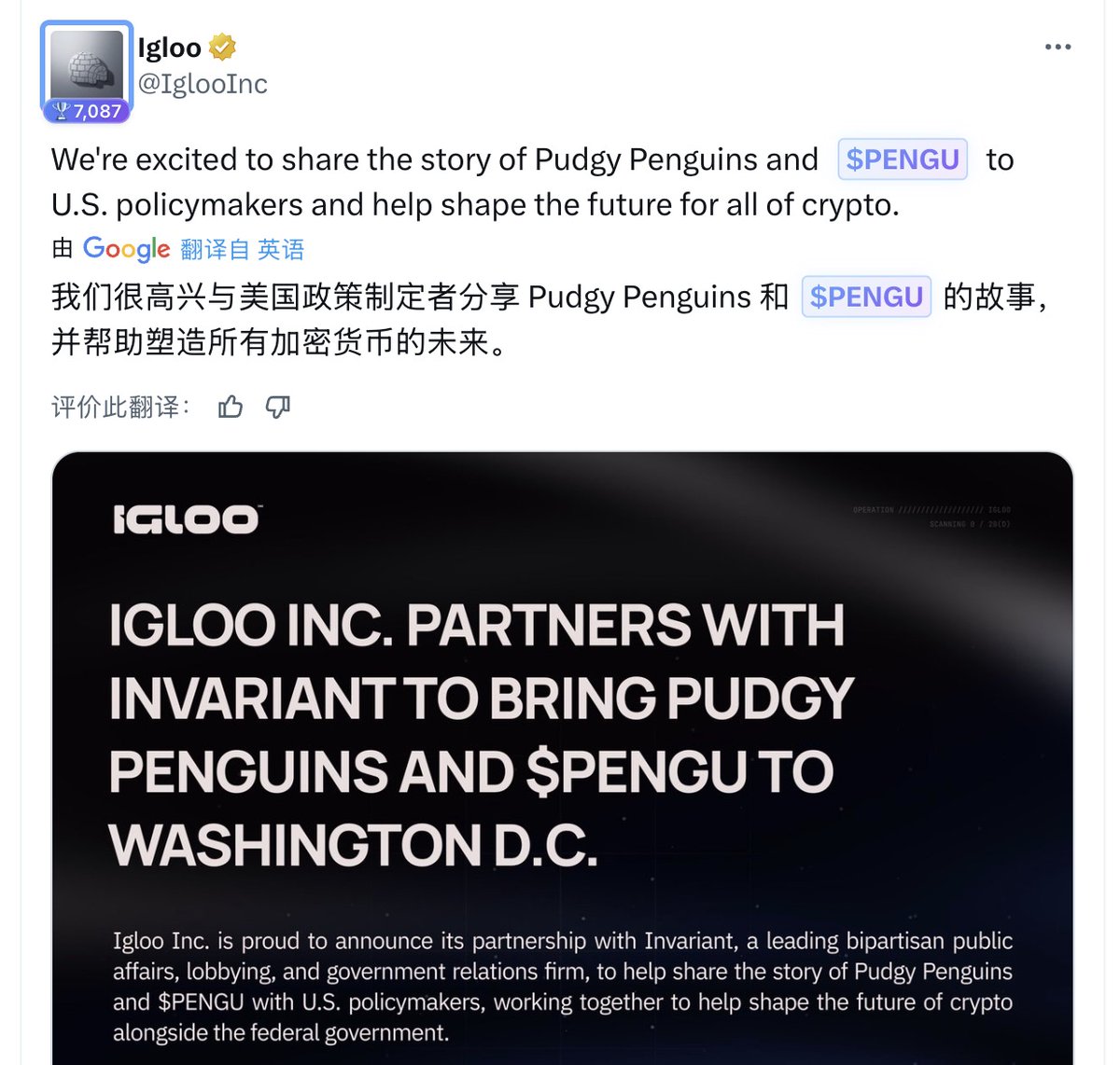 1⃣胖企鹅母公司与Invariant合作,向美国政策制定者分享胖企鹅和 $PENGU 的故事,并与联邦政府合作塑造加密货币的未来。