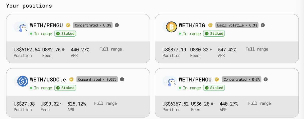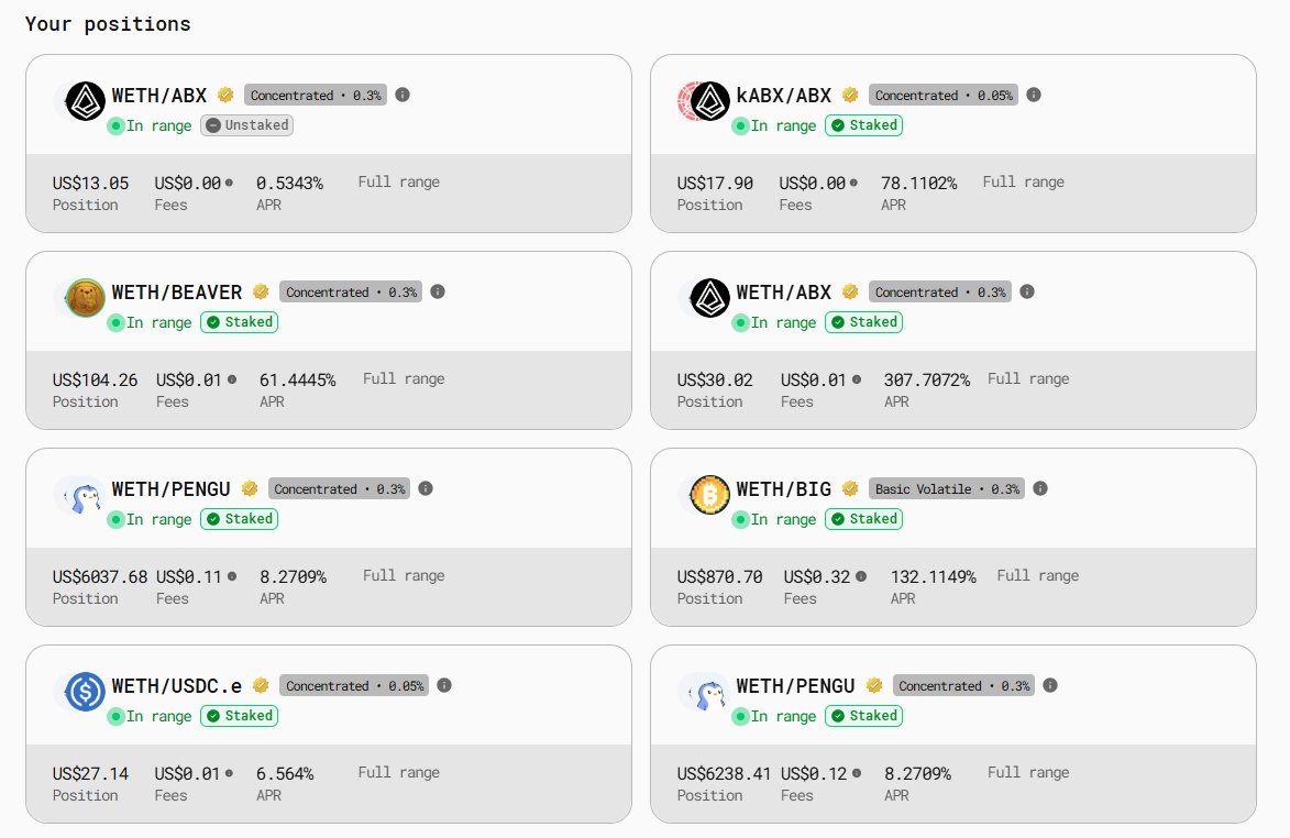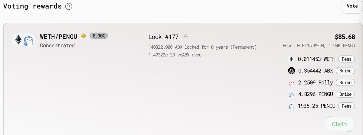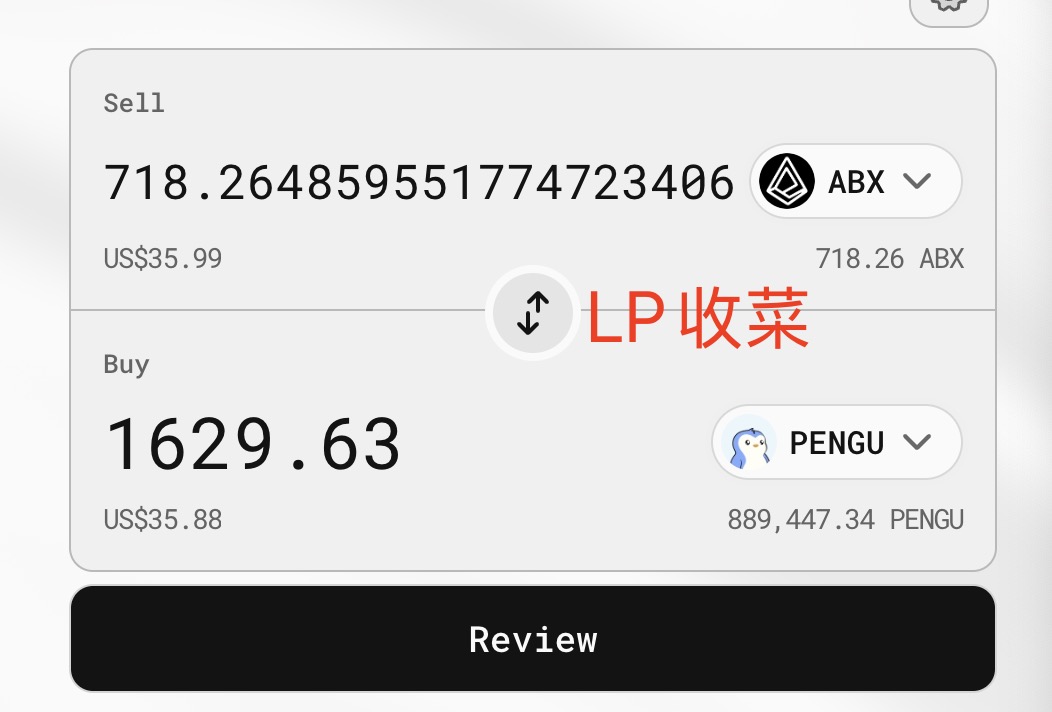 Abstract的DeFi一哥是 @AboreanFi ,我在上面组了1万多刀LP,早上收了35U菜,已全部换成 $PENGU 。