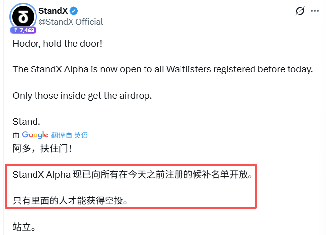 @StandX_Official 从启动至今一直在喂饭,不管是DC身份、预存活动,还是候补申请、Alpha,全程第一时间同步,如果你在Standx撸不到毛,真的要反思了。