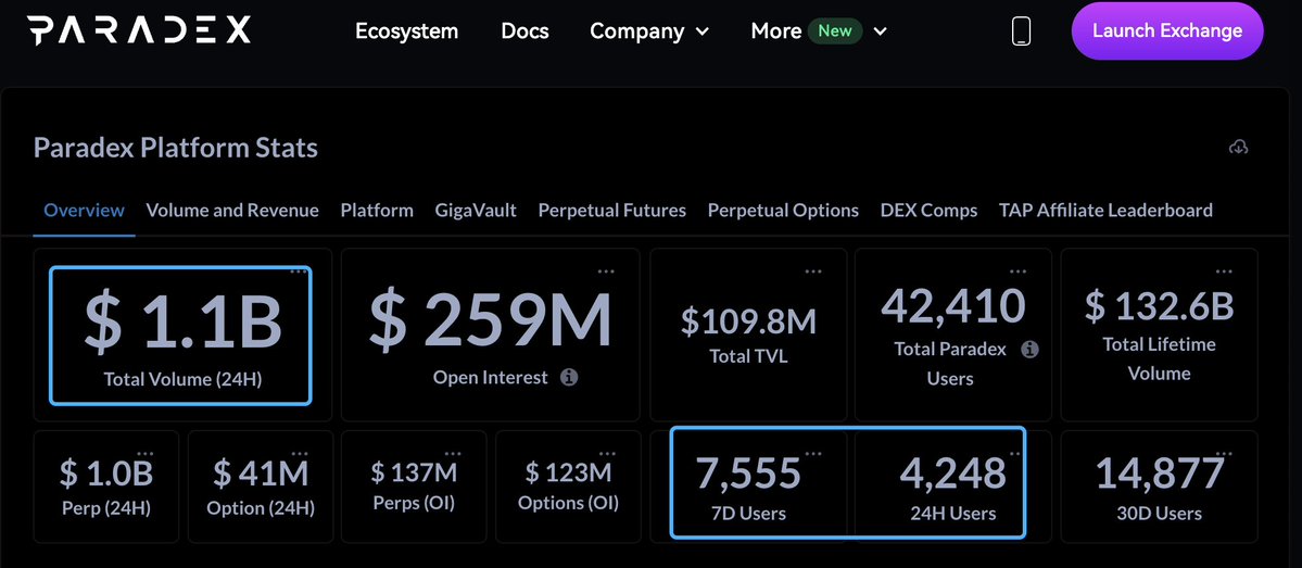 相比于其他几个大热门,Paradex真可谓人少不卷:总用户4.2万,24H活跃用户4.1K,7D活跃用户7.5K,看懂的知道这意味着啥。