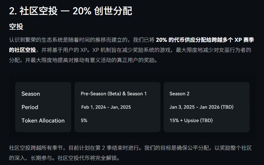 初始空投20%,其中S1-5%,S2-15%,TGE时全部解锁。由于S2延长,最终空投比例会增加。