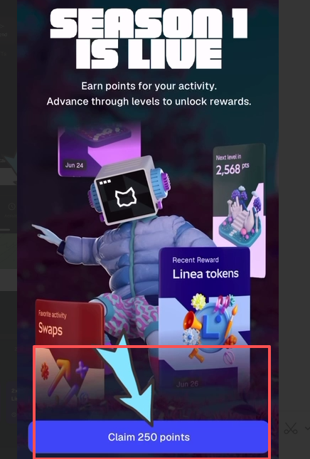 兑换:通过内置Swap兑换,每800美元积10分,移动端任意网络兑换加成50%,走LINEA加成100%,二者可叠加