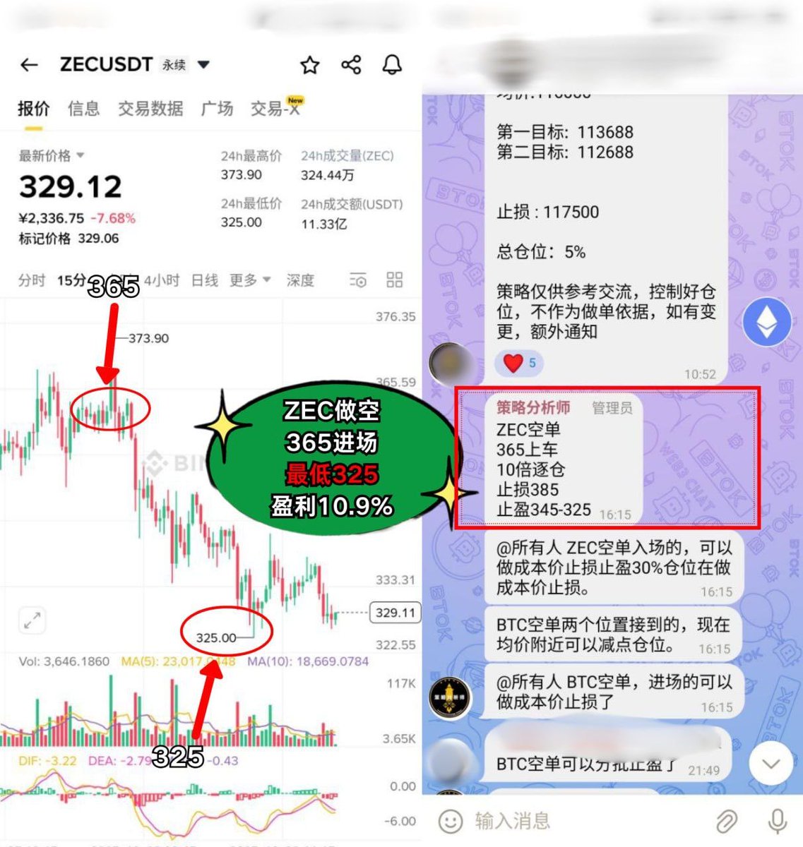 ZEC做空 365进场,精准获利 10.9%