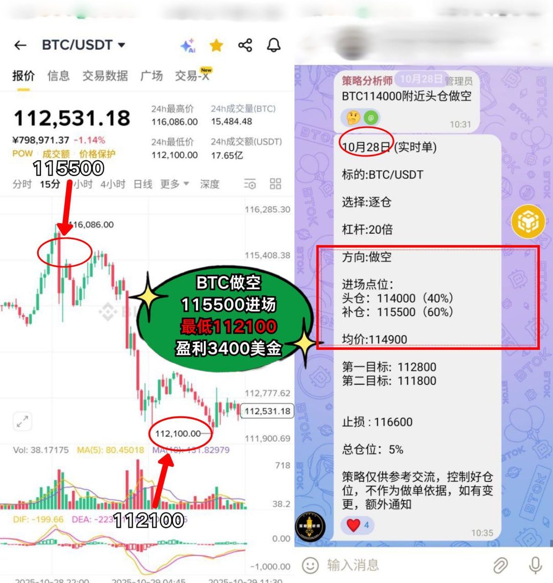 BTC做空:115500进场,稳健盈利 3400美金