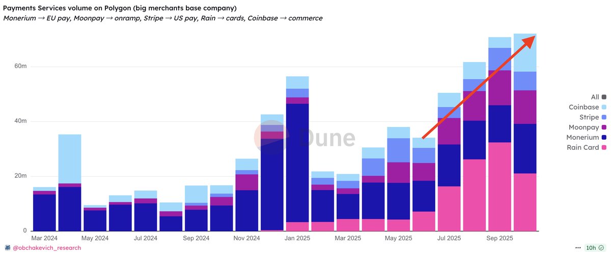 扒了下Dune 上的数据,发现自 @sandeepnailwal 回归以来,Polygon 链上支付相关的交易量逐月持续上涨。