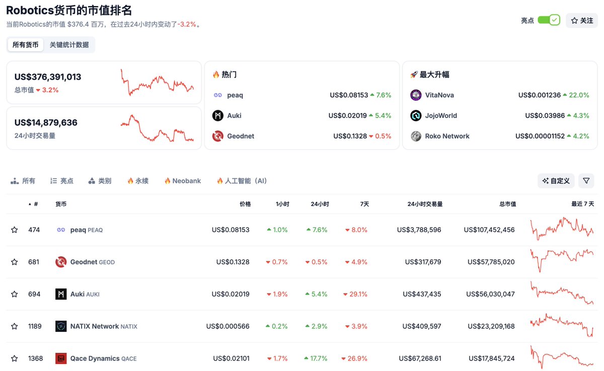 排在最前面peaq 按市值排名仅排在474 位,Robotics 细分赛道龙头还远未出现。